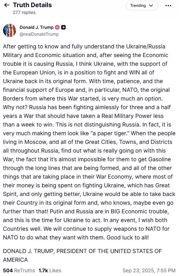 Цитата (Pampa @ Сен 23 2025, 21:53) Ну уж куда им до величайшего недочерчиля, который уже 6 лет ведёт Украину к прекрасному будущему и собирается на следующие выборы. Зеленский конечно далеко не Черчилль, хотя и страна конечно другая, и время (впрочем, он делает немало откровенных глупостей, которые оправдать невозможно). Но признаков клинического идиотизма, в отличие от рыжего поца, он не проявляет. |