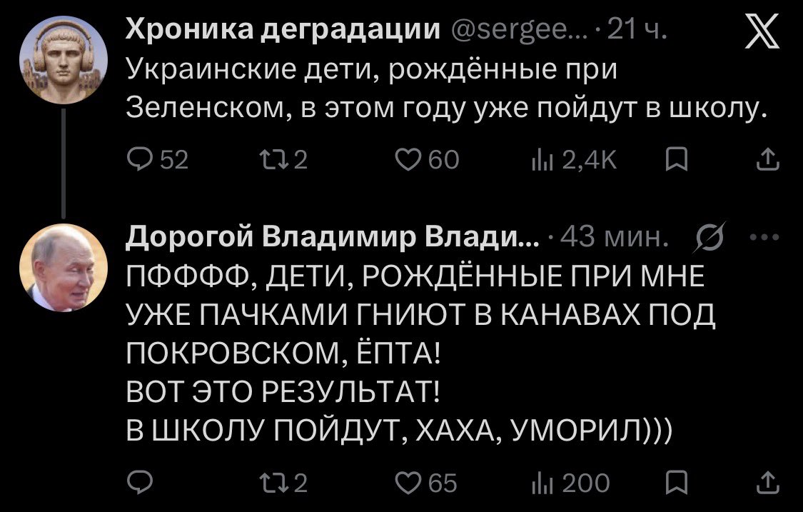 Цитата (fahed @ Апр 17 2026, 14:13) КОРОЧЕ, КУПЯНСК БОЛЬШЕ БРАТЬ НЕ БУДУ.<br>НУ ЕГО НАХУЙ. НЕ НУЖОН.<br>ЕСТЬ БОЛЕЕ ПРИОРИТЕТНАЯ ЦЕЛЬ.<br>ГОРОД-КРЕПОСТЬ, КЛЮЧ ОТ УКРАИНЫ И ВСЕЙ ВОСТОЧНОЙ ЕВРОПЫ. <br>САКРАЛЬНОЕ МЕСТО СИЛЫ.<br>КТО ЕГО КОНТРОЛИРУЕТ, ТОТ ВЛАДЕЕТ МИРОМ.<br><br>ЭТО МАЛАЯ ТОКМАЧКА.— Дорогой Владимир Владимиpoвич 💙 (@king_of_botox) April 17, 2026 -------------------- Такие как ты исподтишка тролят патриота © Madiev.
