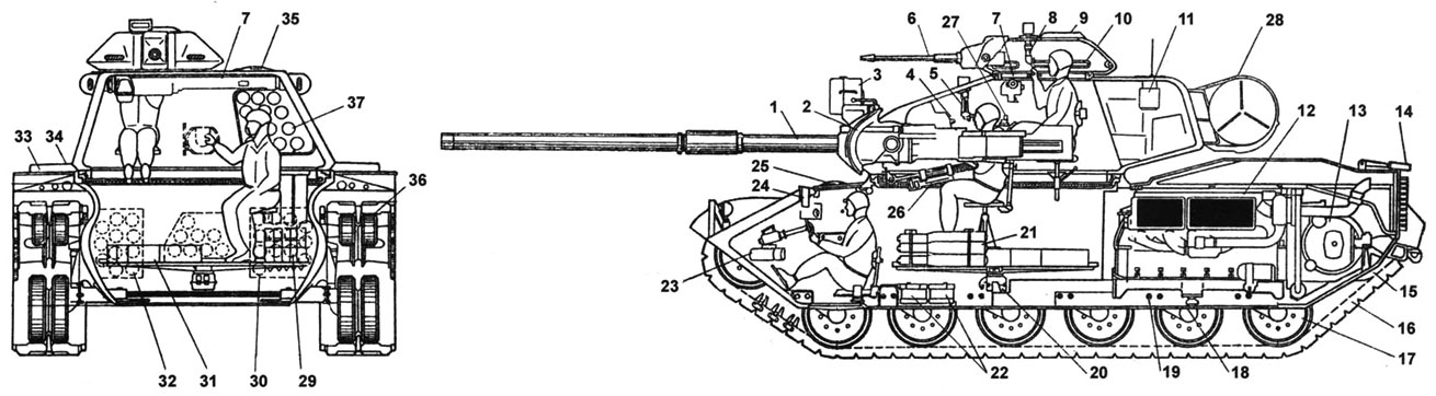 Цитата (truecounter @ Сен 10 2016, 17:02) Ну самый первый совершенно точно не горел и не факт, что был пробит Кума прошла по навесной броне. Компоновка танка М60А1. " 1 — 105-мм пушка М68; 2 — спаренный с пушкой 7,62-мм пулемет; 3—ксеноновый прожектор с видимым или инфракрасным освещением; 4 — окуляр телескопического прицела; 5 — комбинированный перископический прицеп наводчика; 6 — 12,7-мм зенитный (командирский) пуле мет; 7 — дальномер; 8 — комбинированный перископический прицел командира; 9 — люк башенки; 10 — смотровая призма; 11 — вентилятор башни; 12 — двигатель дизеля; 13 — гидромеханическая трансмиссия «Кросс-Драйв»; 14 — кронштейн крепления пушки по-походному; 15 — ведущее колесо; 16 — гусеница с резино-металлическим шарниром; 17 — обрезиненный опорный каток; 18 — клапан для слива; 19 — торсион; 20 — вращающееся контактное устройство; 21 — бое-укладка на 11 выстрелов; 22 — аккумуляторные батареи; 23 — обогреватель экипажа; 24 — перископ водителя; 25 — крышка люка водителя; 26 — силовой цилиндр наведения пушки по вертикали; 27 — баллистический вычислитель; 28 — укладка трубы-лаза ОПВТ по-походному; 29 — боеукладка на 13 выстрелов; 30 — левая боеукладка на 15 выстрелов; 31 — коробки с патронами к пулеметам калибров 7,62 мм и 12,7 мм; 32 — правая боеукладка на 11 выстрелов; 33 — ящик для инструмента; 34 — правый воздухофильтр; 35 — люк заряжающего с перископическим прибором наблюдения; 36 — обрезиненный поддерживающий каток; 37 — башенная боеукладка на 12 выстрелов ". Нажмите для увеличения -------------------- "Нужно прощать своих врагов, но не прежде, чем они будут повешены." - Генрих Гейне.