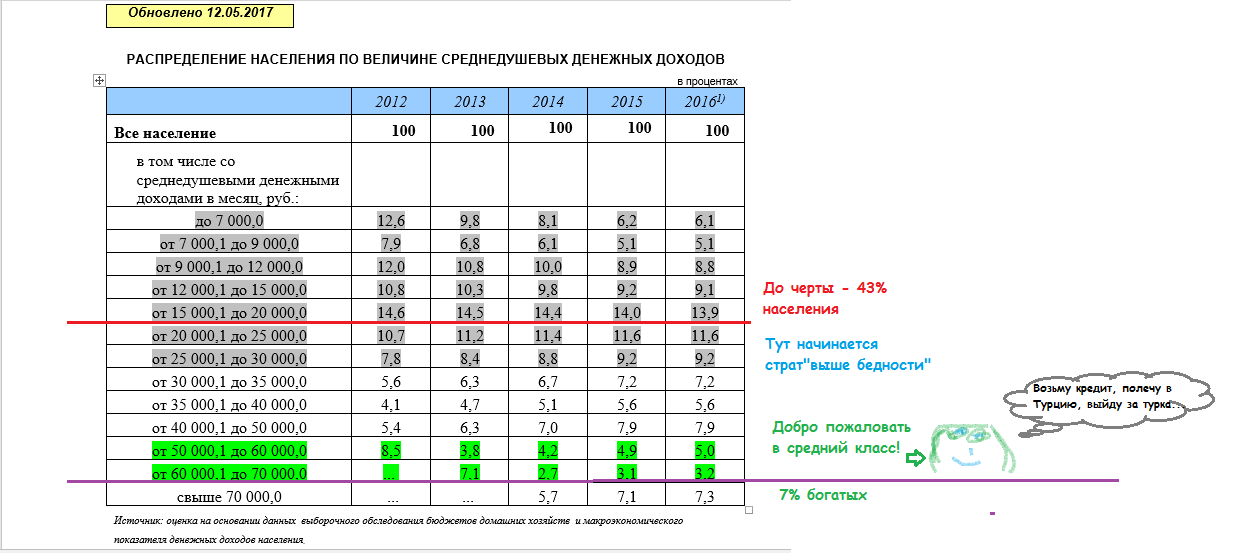 Цитата (PLTV @ Авг 28 2017, 20:23) Чтобы вы тут друг другу не рассказывали восхитительные истории про "брат инженер уехал в Сирию после института, строит какие-то тоннели получает 15 000$ с собой зовёт" вот вам картинка Проценты с госкомстата, пруфец ниже, а деление моё, но это я тоже у госкомстата читал, правда найти не могу. Но, понятно, я как Слаб - говорю правду, потому и не пруфаю найди себя в общем PS меньше 10к на человека в домохозяйстве -> нищий. Т.е. если, к примеру, Бабахчо получает 30 к. и одиноко сычует перед ноутом с corel draw то "он выше бедности", а если у него жена и ребёнок, то он ходитпо охуенно тонкому льду,котоырй называется бедность и под которым его поджидает нищета. ![]() Госкомстат Херня это всё,по моим наблюдениям любой,дажи если он из прастова нарота,может всегда выбраться из нищеты,правда придётся чем то жертвовать,в большинстве случаях самая сакральная жертва эта диван. -------------------- Запомни Русь! Отчизна! Запомни! Отомсти!