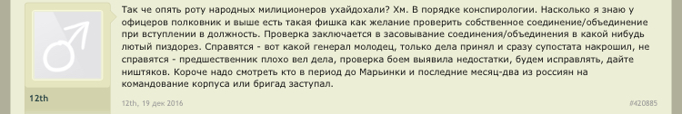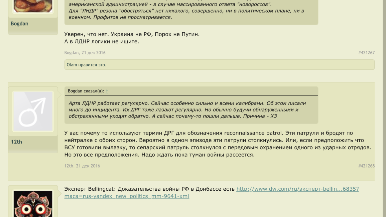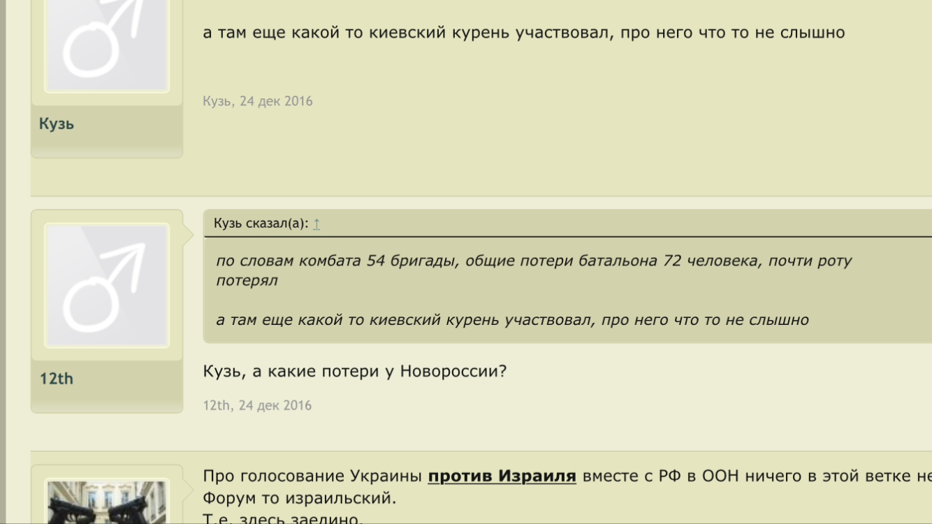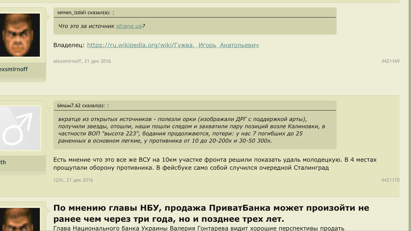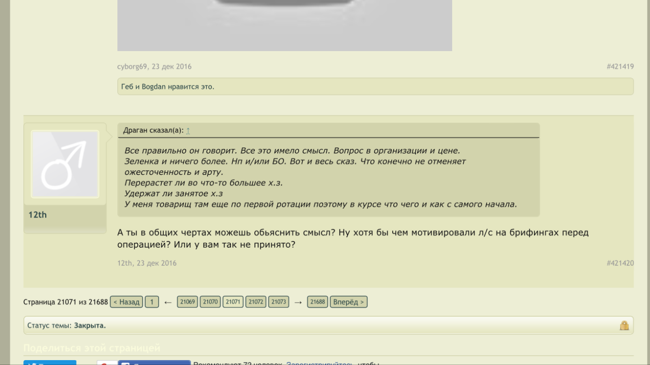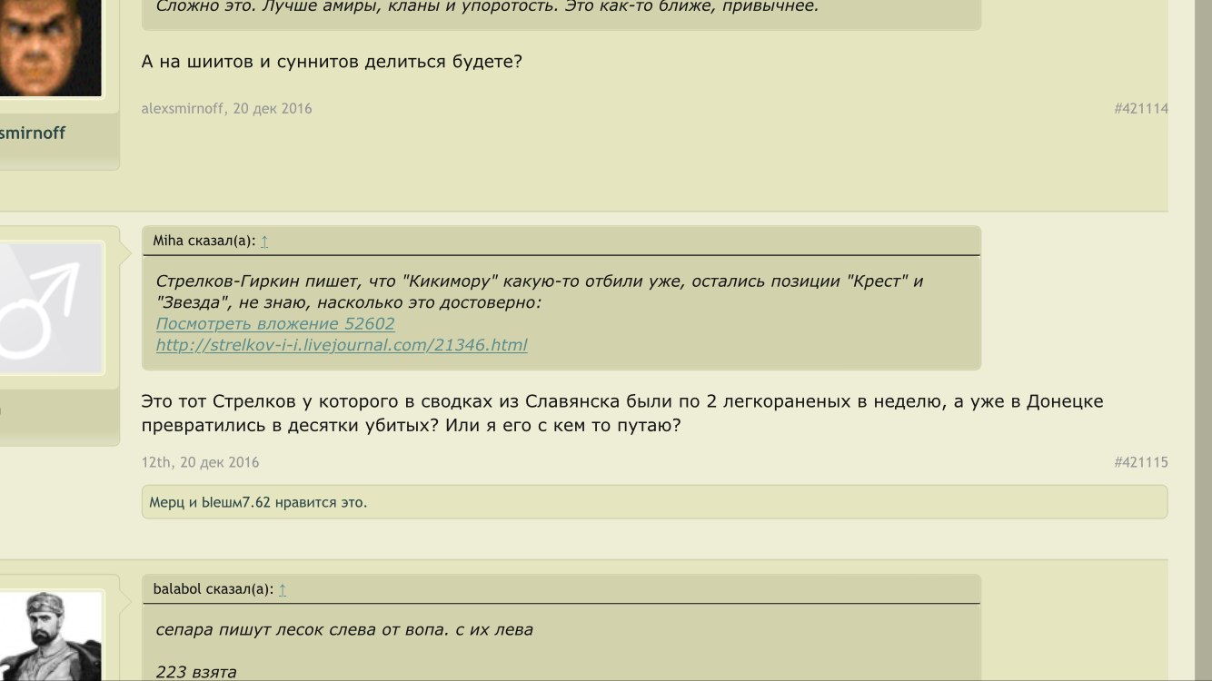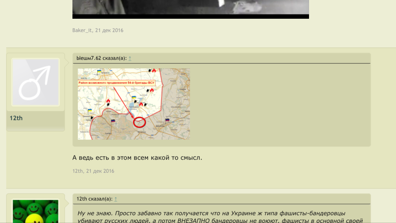 Цитата (simuil @ Ноя 23 2017, 12:39) Дык у Двенадцатого то ещё двоежопие. Что показали события у «избушки лесника»: Как только появилась инфа о тех боях, Двенадцатый и все патрiоты с форума исхода заняли укратнскую версию событий: «сепары пошли в атаку». Двенадцатый накатал длинопост смысл которого в том, что часто новые командиры ведут подразделение в бой, выиграют - вот какой я молодец, только заступил, а уже победы; проиграют - предыдущее командование не научило людей воевать. Закончил это всё мыслю, что разумеется командованию пох на жизнь сепаров, гонит его помирать за просто так. О, каждый лайкал этот пост. Потом выяснилось, что это ВСУ пошло в атаку, ну дык Двенадцатый и патрiрты переобулись, не в первой же? Избушка лесника стала тактически важным объектом, а оставленные трупы ВСУшников в лесу печальными потерями за правильные вообще-то стремления. Так так. Ну я в общем не поленился и нашел этот пост. Помоему вы немного запизделись в деталях, гражданин. ![]() С этого момента я считаю, что как пострадавшая сторона, имею право величать вас исключительно Двоежопым. -------------------- Zа макееVский рОдничок