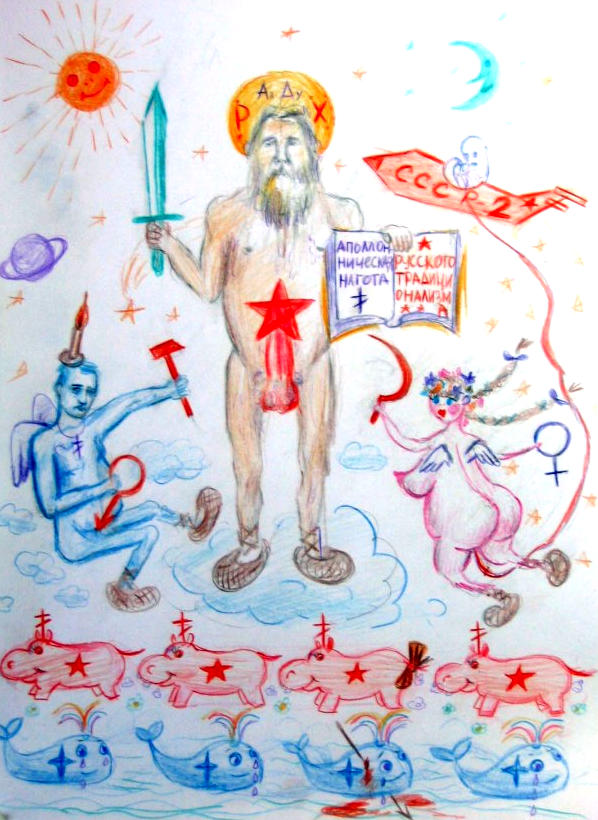 ![]() https://vernaya-vera.livejournal.com/4772.html Наиболее четкое пояснение картины Центральной фигурой композиции выступает увенчаный нимбом и аполлонически нагой русский философ Александр Дугин. Буквы "Р" и "Х" (русский Христос) соседствуют на нимбе с буквами "А" и "Ду", разьясняя роль Дугина в духовном возрождении нации. "Не мир пришёл я вам принести, но меч", намекает предмет в правой руке видного геополитика. На всё остальное намекает мощно эрегированный фалос. Но ни меч, ни фаллос не спасут. Слева на картине виден Сатурн-Кронос, а справа кустодиевских пропорций женщина держит в руке серп. Дугинский фаллос по задумке автора видимо должен повторить судьбу фаллоса Урана: упасть в море и вспучить его пеной, из которой выйдет Афродита - богиня любви к Родине. В нижней части картины происходит наглядная геополитика. Символизирующие сухопутную империю Бегемоты (не путать с гиппопотамами), осенённые звёздами, крестами и символом русского империализма (черно-жёлтая ленточка) ведут борьбу с талассократическими Левиафанами, выступающими под знаком НАТО. Даже самые незначительнае детали у художника наполнены глубоким символизмом - Левиафаны испускают радужные ЛГБТ фонтаны, а Бегемоты какают полевыми цветами. Мужское и женское начала заняли места геральдических щитодержателей Дугина. Мужское начало представлено ангелоподобным Путиным. Серп и молот в их руках не только отсылают зрителя к мухинским "Рабочему и Колхознице", но и несут самостоятельную символику. Так, молот символизирует напряжённую, "как краб на галлерах", работу главы государства. Женское начало, судя по венку, символизирует вернувшуся в лоно империи Украину. Оплодотворённая идеями Дугина и мужским началом Путина, Украина даёт жизнь космической программе СССР-2. Даёт жизнь, но в далёкий космос не пускает, придерживая за пуповину. В целом мужское и женское начало, земная и водная стихия, во главе с Дугиным, складываются в пятиконечную звезду, венчающую фаллос главного русского традиционалиста. Некоторые детали на картине, увы, остались мне неясными: 1. Что за свеча на голове у Путина? Имеется ли в виду, что он "светоч" или смысл тут тоньше? 2. Что за инопланетянин сидит в ракетоплане СССР-2? 3. Почему Путин, Украина и Дугин обуты в лапти, а Бегемоты - нет? Они не традиционалисты? https://fat-yankey.livejournal.com/147835.html -------------------- Zа макееVский рОдничок