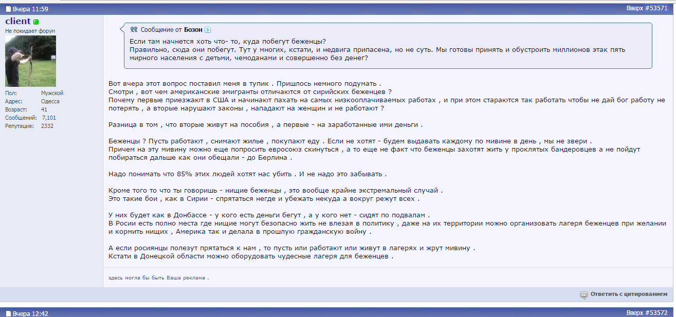 Пора гасится. ![]() Цитата Беженцы ? Пусть работают , снимают жилье , покупают еду . Если не хотят - будем выдавать каждому по мивине в день , мы не звери . Причем на эту мивину можно еще попросить евросоюз скинуться , а то еще не факт что беженцы захотят жить у проклятых бандеровцев а не пойдут побираться дальше как они обещали - до Берлина . Надо понимать что 85% этих людей хотят нас убить . И не надо это забывать . Кроме того то что ты говоришь - нищие беженцы , это вообще крайне экстремальный случай . Это такие бои , как в Сирии - спрятаться негде и убежать некуда а вокруг режут всех . У них будет как в Донбассе - у кого есть деньги бегут , а у кого нет - сидят по подвалам . В Росии есть полно места где нищие могут безопасно жить не влезая в политику , даже на их территории можно организовать лагеря беженцев при желании и кормить нищих , Америка так и делала в прошлую гражданскую войну . А если росиянцы полезут прятаться к нам , то пусть или работают или живут в лагерях и жрут мивину . Кстати в Донецкой области можно оборудовать чудесные лагеря для беженцев . Отсюда, форум Одессы -------------------- |