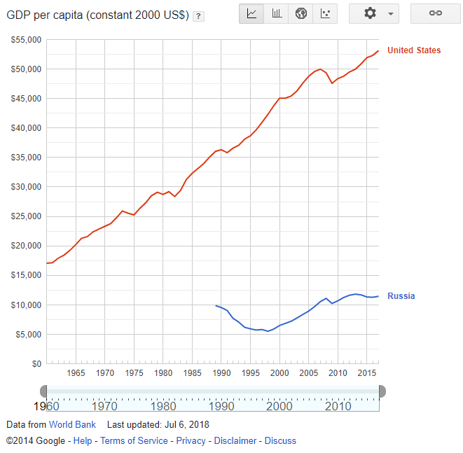 Цитата (Manny Calavera @ Май 7 2019, 15:31) В порядке оффтопа без всякого отношения к Россиюшке. Никогда не приводите график ВВПшечки в текущих ценах. ВВПшечка США к 2017 году +18,8% в физвыражении/постоянных ценах, +9,6% на душу. Верное замечание. Ещё на душу населения, чтобы точно вопросов не было: |