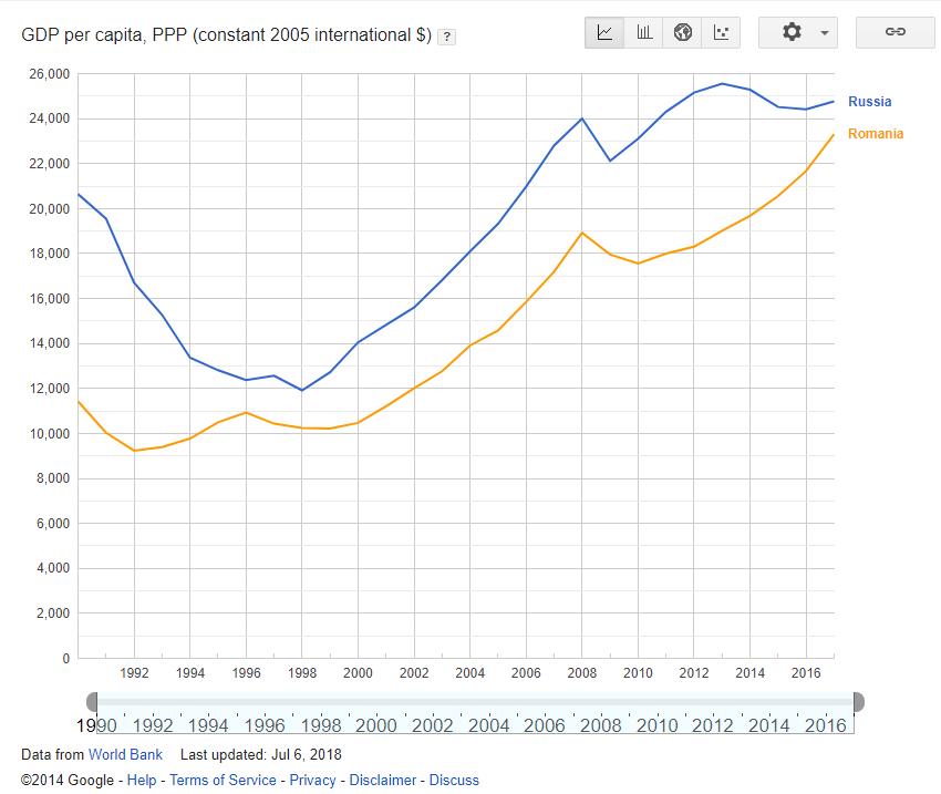 Цитата (МИХАЛЫЧ @ Май 11 2019, 16:18) верно. но глобальная глобализация Румыния при глобализации стала жить лучше? Тем, кто может уехать - да. А кто нет? Ну давай посмотрим ![]() Вступила в ЕС Румыния в 2007. Из кризиса 2008 конечно выкарабкивалась тяжко, но сейчас темп роста набрала прекрасный. Так и Россию по ВВП ППС обогнать через пару лет может. |