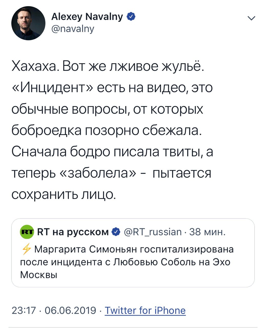 Цитата (pilotv @ Июн 7 2019, 13:09) Итог дискуссии, все аргументы сводятся к 1) А вот НТВ 2) А вот Скабеева 3) А вот Чуркин и Лавров 4) А вот во власти тоже пидорасы Про то что главный оппозиционный политик повел себя как полный мудак, по сути также как и тех кого он критикует , то такое неинтересно. Навальный частенько ведёт себя как мудак, но я специально ещё раз пересмотрел видосик. И не увидел на нём ничего такого - обычные вопросы. Да, спрашивает напористо, но не случайного человека, а целую ответственную за экспортную госпропаганду. Да ещё и целенаправленно пришедшему на эти самые острые вопросы отвечать. А вот как RT пытались рассказать про госпитализацию ПОСЛЕ интервью на Эхе, как если бы это случилось после вопросов Соболь - отдельный кек |