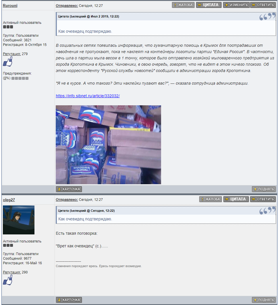 Цитата (oleg27 @ Июл 2 2019, 12:27) Есть такая поговорка: "Врет как очевидец" (с.)...... Ну т.е. я вру, а ЕР не клеила свои наклейки в Крымске, я правильно понял? Ну вот пиздец же. Казалось бы, очень хорошо изученный кейс в плане волонтерства, действий МЧИ, казачества, армии и т.п. Но нет, надо же защитить родного барина и чот спизднуть просто чтобы спизднуть. А чей копирайт на поговорке ты поставил, кстати? |