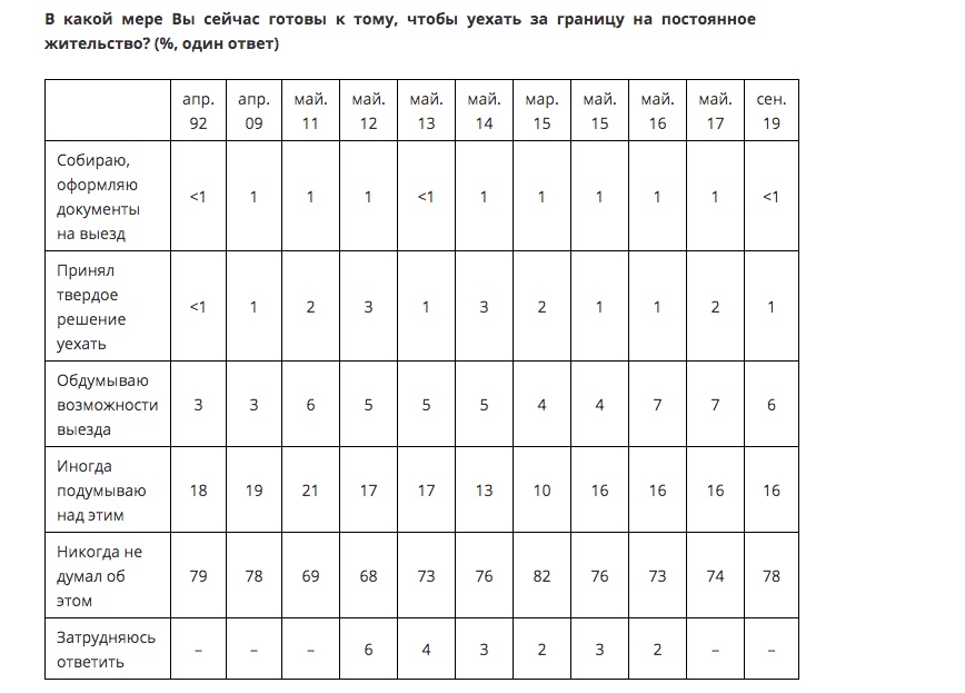 Цитата (Manny Calavera @ Ноя 28 2019, 10:01) Это есть в первоисточнике. https://www.levada.ru/2019/11/26/emigratsio...-nastroeniya-4/ Спасибо как говорится ЧТД Начиная с 92 года процент людей которые как минимум обдумывают возможность переезда и как максимум собирают пакет документов составляет около 7 % +/- 2% Причем в 16 и 17 годах он был больше а сейчас меньше. Хорошая демонстрация почему нельзя ничего от журнашлюх принимать на веру. -------------------- Красный цвет - цвет администрации. © Pampa