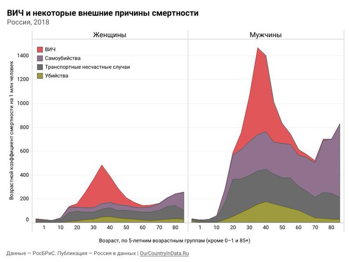 Цитата (pilotv @ Сегодня, 12:10) смертность по заболеваниям Дорожно-транспортные происшествия (ДТП) и Самоубийство - это болезнь? Кстати уж по ВИЧ в Моем городе заместитель начальника управления здравоохранения Екатеринбурга Татьяна Савинова Цитата в Екатеринбурге ситуация с распространением ВИЧ-инфекции уже давно достигла стадии эпидемии. "Сейчас почти каждый 50-й житель Екатеринбурга ВИЧ-инфицирован. Город уже давно вышел в стадию эпидемии по ВИЧ, которая наступает, когда заболеванием поражено свыше 1% населения https://tass.ru/obschestvo/3751078 " Есть, впрочем и позитив Цитата За 8 месяцев 2019 года снижение новых случаев заболевания ВИЧ-инфекцией в Свердловской области составило 9,6% по сравнению с аналогичным периодом прошлого года. В 2018 показатель заболеваемости составил 143,5 на 100 тысяч населения, что на 11% ниже уровня 2017 года (159,1) и на 17,5% ниже уровня 2014 года (174,0). Следует отметить, что в целом по Российской Федерации снижение новых случаев ВИЧ-инфекции отмечается только с 2018 года, и в первом полугодии 2019 года составило 7,3%. http://midural.ru/news/list/document155488/ P.S. Про ВИЧ я про город написал, не про область (на 100 тыс населения область только на 4м месте) -------------------- Вы держитесь, здоровья вам, хорошего настроения