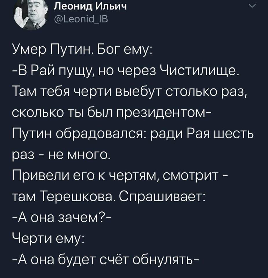 Цитата (fahed @ Мар 11 2020, 16:14) Чо, первый вариант не прокатил? Решил придать остроты? Безымянный Кот считает представителя высшего законодательного органа власти и главу федагентства не представителями вертикали власти - а хуйню несу я. Топ кек чебурек. конечно ты несешь, причем без вариантов вот просто на секунду задумайся - Путин приглашал Трампа на 9 мая. Главу государства которое только что войну нам не объявило. Можешь представить обратное? |