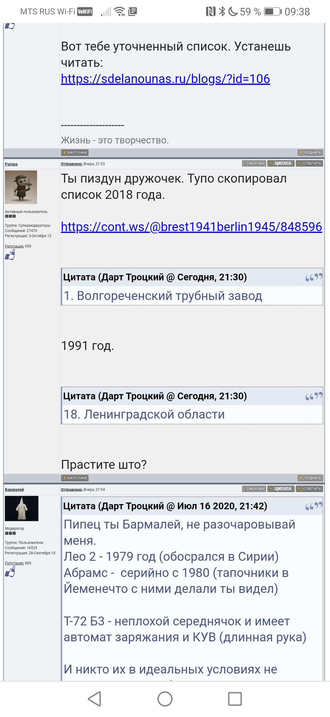 Цитата (Дарт Троцкий @ Июл 17 2020, 07:52) Ну да ну да. А наши будут стоять и смотреть. Напомню мы выяснили, что после обстрела Инваром (или что там из КУВ) мы имеем Абрамс с одним прибором наблюдения из двух, пробитым стволом, снесенной близким подрывом Трофи (ну или выведенными из строя ее РЛС) и сильно напуганным заряжающим. А война еще не закончилась. Потому что Абрамс за это время преодолел 500м и ему еще до рубежа эффективного огня (3 км) ехать 1500 метров. И это еще при условии что рефлекс не пробил лобовую броню (уязвимости есть у Абрамса и шанс пробития вполне себе есть). Наконец мы подъехали к рубежу 3 км и тут давай сравнивать Свинец 2 и М 829, а также стойкость лобовой брони. Но блин,эти танковые сражения маловероятны.Как вы меня не услышите? Танк надо сравнивать в комплексе. Допустите наконец что есть военные эксперты поумнее вас, и исходя из общих характеристик они делают выбор в пользу Т 90 (ХИТ ПРОДАЖ). И это несмотря на американское лобби и недобросовестную конкуренцию. Ты даже сам не замечаешь, какую глупость ты пишешь: ну каким чертом будет "снесенной близким подрывом Трофи (ну или выведенными из строя ее РЛС)", если КАЗ и предназначен для того, чтобы уничтожать выстрелы ПТРК? Гораздо более могущественные, чем ракеты от КУВ. При этом есть еще и дымзавеса, в которой наведение КУВ теряется. А за это время (подлета рефлекса) в наш танк ударят две кувалды: тут тебе не только "заряжающий испугается" - тут вполне очевидна встряска всего экипажа. Это при условии, что не пробьют. И им там будет уже не до корректировки полета рефлекса. Ладно, сравним танки в комплексе. Наш хуже, ибо: хуже орудие, хуже броня, хуже системы, меньше запас хода, меньший ресурс, меньше ремонтопригодность, худшие условия обитания. Наш танк взрывопожароопасен, в конце концов. Меньшие габариты преимуществ не дают и лишь меньшая масса позволяет легче решать проблемы с переброской. Но есть такая лженаука - логистика, которая позволяет транспортировать и более тяжелые танки с успехом. Покупают же наш танк очевидно из желания сэкономить. -------------------- Это именно тот случай, когда Мамашу следует цитировать на полном серьёзе (с) PLTV