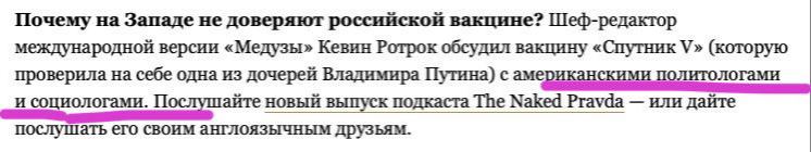 Политологи и социологи из США на Медузе , расскажут Вам почему российская вакцина говно. Вирусология и либеральная пресса в одном флаконе ,которую мы все заслужили .