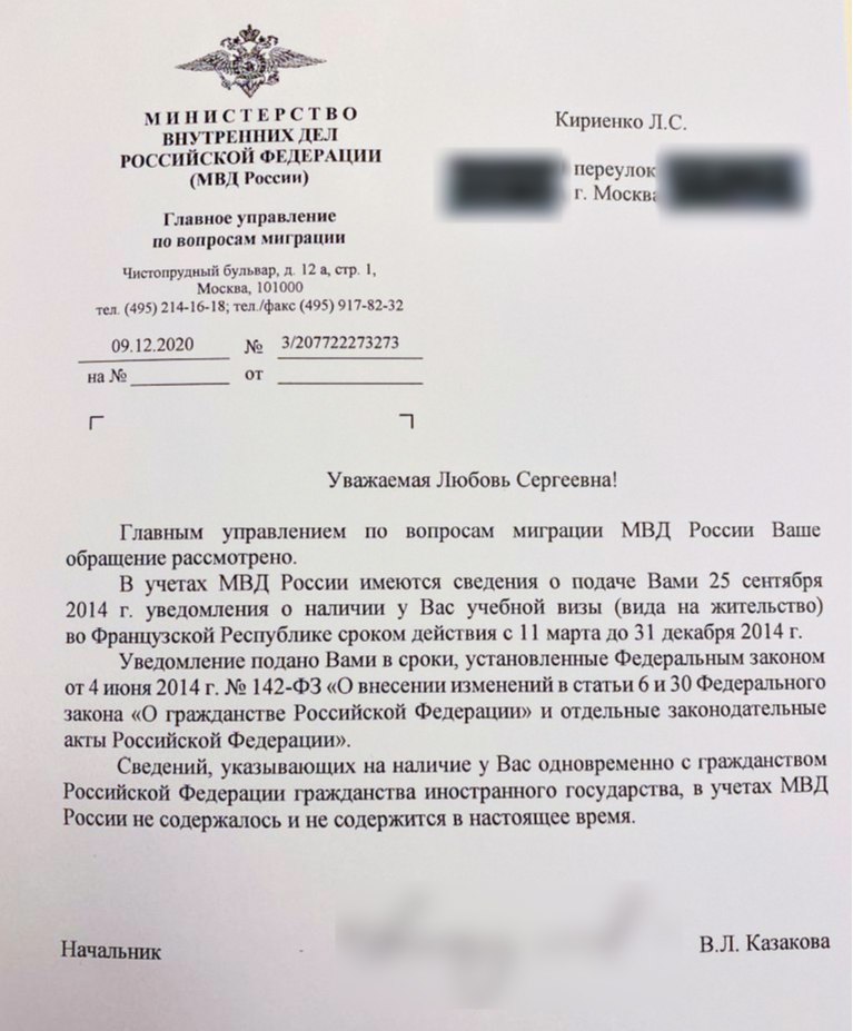 Цитата (Бармалей @ Дек 9 2020, 18:53) "Это вранье" да они всегда так говорят. Пусть подаст в суд Лондона иск Как бе вот. Дочь первого заместителя главы администрации президента Любовь Кириенко получила справку Главного управления МВД по вопросам миграции, в которой указано, что сведений о наличии у нее одновременно с гражданством России гражданства иностранного государства «в учетах МВД России не содержалось и не содержится в настоящее время». Копия документа есть в распоряжении РБК. РБК направил запрос в пресс-службы МВД России и Франции. Накануне The Insider со ссылкой на «базу лиц с двойным гражданством» МВД писал о том, что Любовь Кириенко получила гражданство Франции. У ее полной тезки, как писало издание, совпадают с ней дата рождения и номер паспорта. Кириенко в четверг вечером подтвердила РБК получение документа из миграционного управления МВД, предоставив редакции его копию. Справка датирована 9 декабря. В отношении публикации о наличии у нее двойного гражданства она заявила, что «определит свои действия позднее». Согласно документу МВД, в 2014 году Кириенко подавала уведомление о наличии учебной визы (вида на жительство) во Франции сроком на 10 месяцев. В разговоре с РБК она сообщила, что пользовалась визой на время учебы, документ истек 31 декабря 2014 года и с тех пор она «как все получает обычные шенгенские визы» (визы выдаются только иностранцам — ред.). ![]() -------------------- Красный цвет - цвет администрации. © Pampa