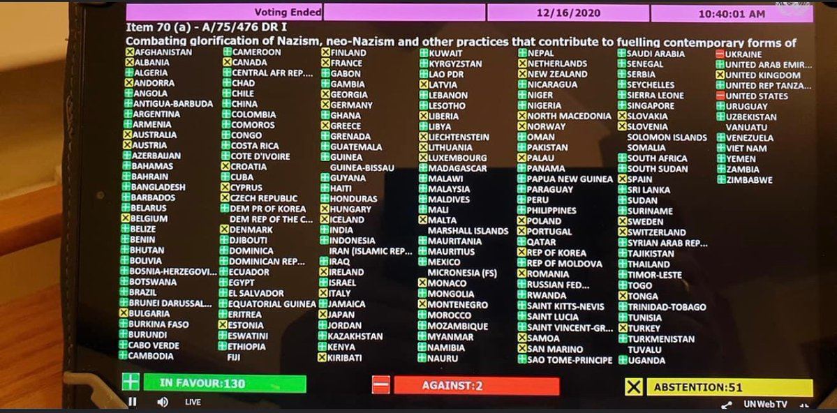 На Генассамблее ООН только две страны проголосовали против российской резолюции о борьбе с восхвалением нацизма и неонацизмом - США и Украина Список воздержавшихся тоже доставляет -------------------- Красный цвет - цвет администрации. © Pampa