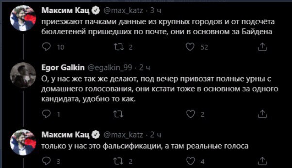 Цитата (pilotv @ Ноя 6 2020, 07:35) Обожди ка я правильно понимаю что на вопросы по подобной картине - [attachmentid=13838] В Мичигане признали что обьебались на 140 тыс голосов , а вот в Висконсине сказали , что таки да все нормально ? Да нет, не показалось сказали что все норм, ошибки нет . https://apnews.com/article/election-2020-jo...cc6cd3a5796ec33 То есть имеем два абсолютно аномальных броска при подсчёте голосов . Но в случае Мичигана вот это ошибка клерка , [attachmentid=13837] а в случае Висконсина это так просто по почте голосовали , "перекос" голосования как ты его назыал. [attachmentid=13836] Короче смотри не перепутай . Я конечно в курсе синего смещения при голосовании на почте но это явно не то что изображено на этом графике. За Трампа видимо по почте вообще не голосуют от слова совсем. Если ты откроешь глаза и посмотришь ещё раз на графики - они НЕ одинаковые. В Мичигане была ступенька за Байдена онли. В Висконсине одновременно скакнули вверх и Байден, и Трамп. А если бы ты сходил по моей ссылке и почитал, ты бы поняли почему такой скачок произошёл: Under state law, the totals from absentee ballots won't be released until the very last one passes through a tabulating machine. Votes from individual polling places will be released when they're sent to the county. Английским по белому написано, что результаты по почтовому голосованию публикуются только когда посчитают все сразу. А их много: The first of more than what could be 175,000 ballots mailed in, deposited in drop off boxes or cast during early in-person voting can't be counted until 7 a.m. В городах распределение на изи может быть 60/40 или даже 70/30 в пользу Байдена. Например в выйгранном Трампом Техасе в Остине (1млн населения) 70% взял Байден. А почтовое голосование имеет дополнительный перекос в пользу Байдена, поскольку он призывал голосовать по почте, а Трамп призывал приходить лично. Вот отсюда и получился такой скачок. Цитата И я реально не понимаю какие у тебя после этого претензии к Чурову , у него там тоже видимо "перекос" в голосовании , бывает . |