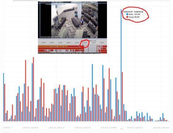 Юристы Трампа сегодня обнародовали . Панфилова одобряе. Видео снято камерами внутреннего наблюдения в центре обработки бюллетеней, расположившегося в здании State Farm Arena в Атланте. В 10:30 вечера сотрудники счетной комиссии сообщили республиканским инспекторам, что они должны прервать работу из-за того, что в здании прорвало водопроводную трубу и вызвана аварийная команда для ее ремонта. Когда республиканские инспекторы ушли, оставшиеся работники участка достали из под стола еще четыре чемодана с бюллетенями и продолжили подсчет. Именно после появления этих чемоданов , на графике зафиксирован резкий скачок голосов за Байдена . -------------------- Красный цвет - цвет администрации. © Pampa