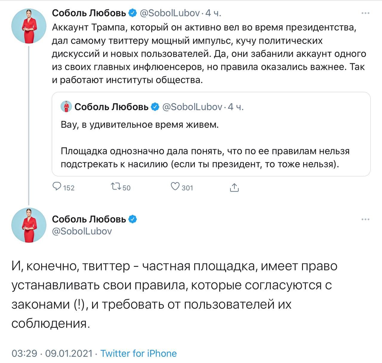 ![]() ![]() Цитаты из объяснений администрации Twitter по поводу блокировки аккаунта Трампа на постоянной основе: «Использование слов «американские патриоты» для описания его [Трампа] сторонников может трактоваться как поддержка тех, кто совершал насилие в Капитолии»; «Заявление Трампа о том, что он не будет присутствовать на инаугурации [Байдена], часть его сторонников воспринимает как ещё одно подтверждение того, что выборы были нелегитимными». Трамп прокомментировал блокировку словами «Нас не заставишь замолчать!», добавив, что сейчас ведутся переговоры с другими площадками -------------------- Красный цвет - цвет администрации. © Pampa