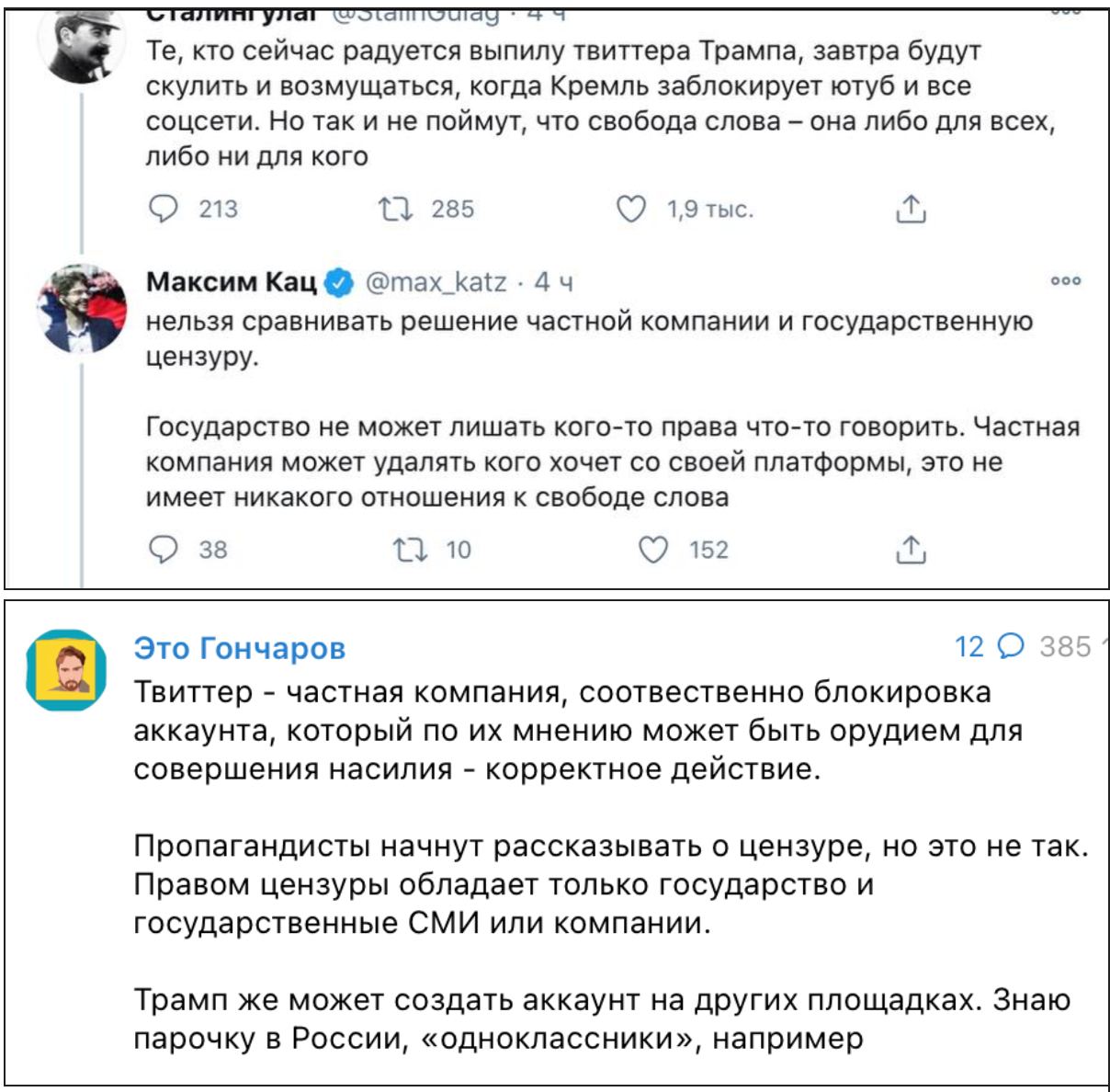 типа, если фахед кого то забанит то все, кончится демократия в мировом масштабе, чи шо? твиторы все эти частные шарашки, что хотят то и делают, в соответствии со своими представлении о прекрасном это как раз нормально |