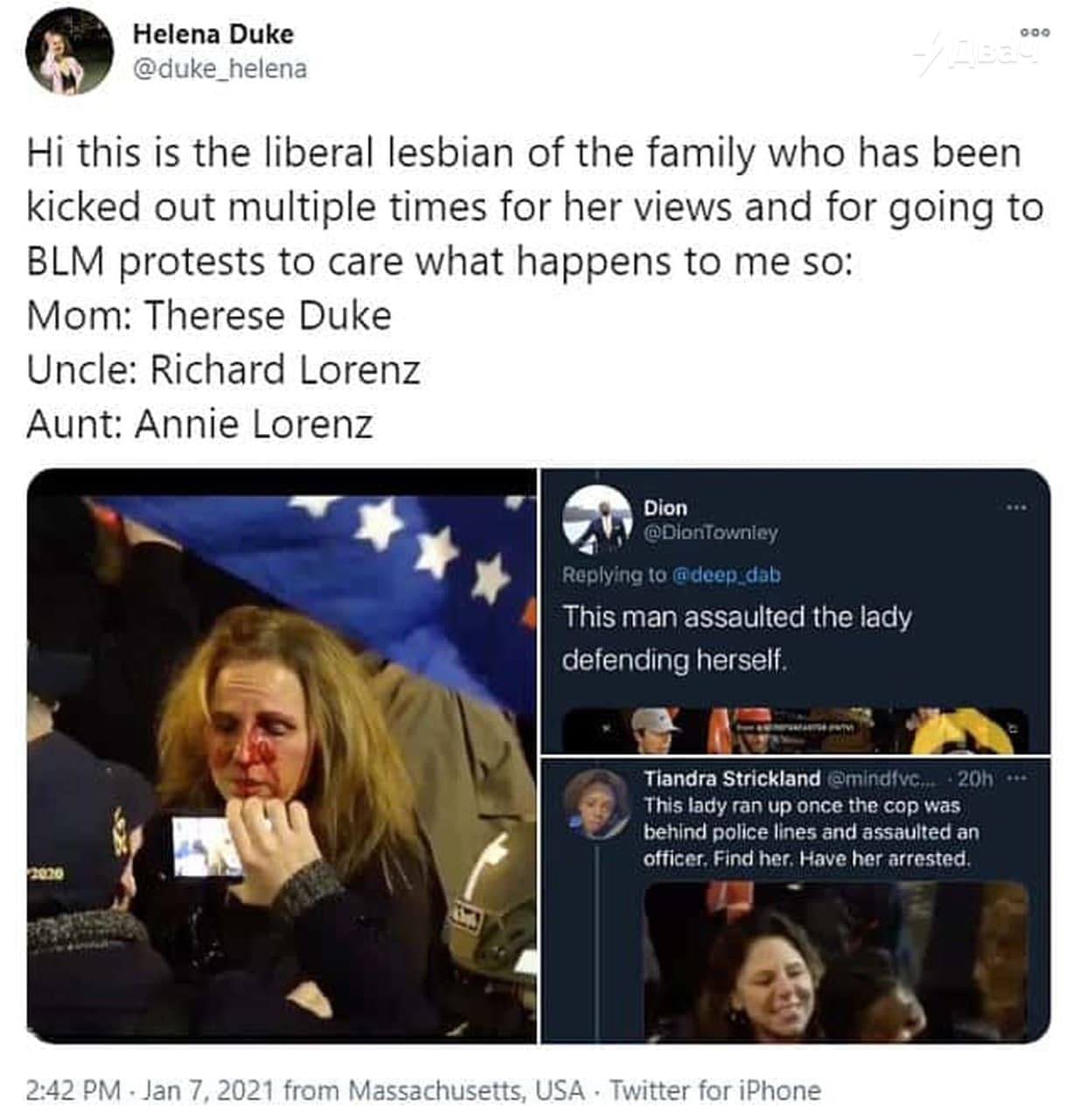 Тут вот молодая лесбиянка , поклонница BLM опознает и сдает как стеклотару свое семейство в лице мамы , дяди и тети , котрое посетило Капитолий . Ну и неравнодушные граждан подтянулись , осматривают съёмки пытаются опознать и сигнализировать органам. Нашим охранителям учиться , они до такого помоему ещё не дошли. -------------------- Красный цвет - цвет администрации. © Pampa
