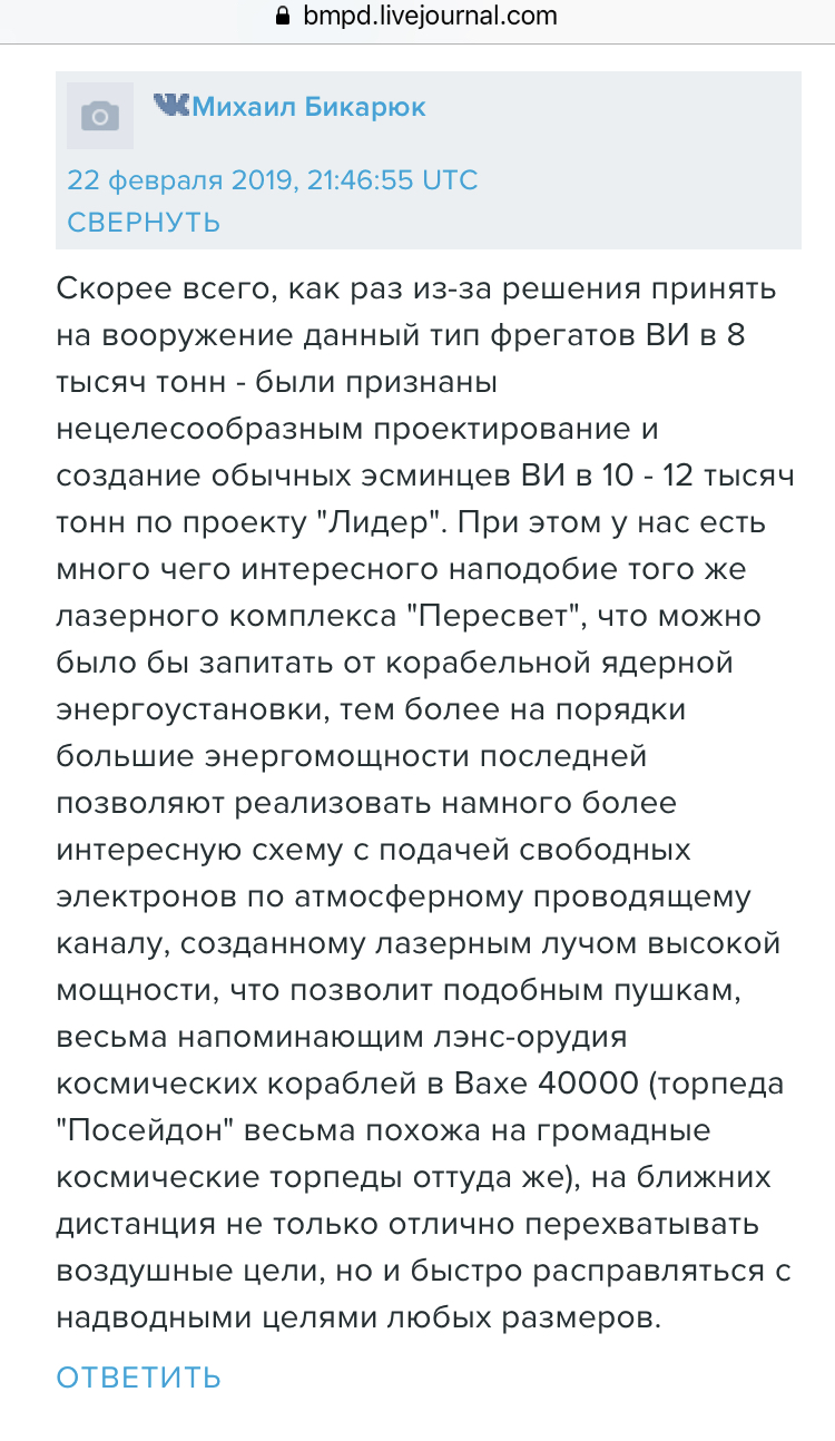 Цитата (Полес @ Фев 23 2019, 23:20) Водоизмещение перспективного эсминца для ВМФ России выросло до 19 тысяч тонн https://bmpd.livejournal.com/3543028.html Ну и сколько таких эсминцев сможет построить Россия? 4. Что вообще за гигантомания с атомными подлодками и эсминцами... Отличный камент оттуда. ![]() Теперь понятна аудитория ракет с непредсказуемой траекторией -------------------- Zа макееVский рОдничок