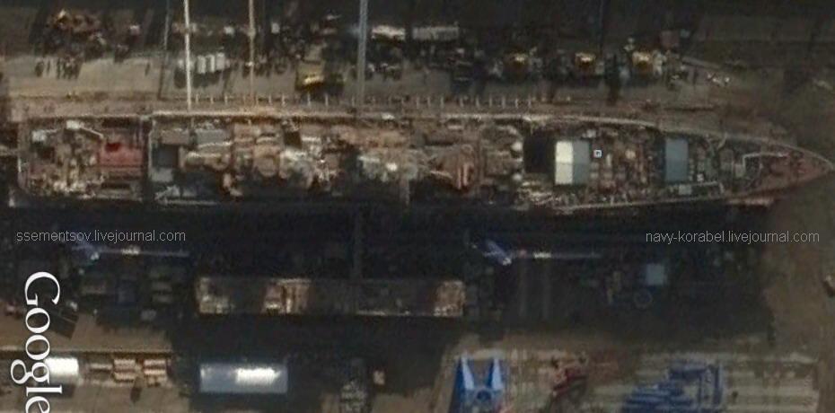 Последней новостью по части модернизации " Нахимова", взбудоражившей общественность, стало возможное вооружение крейсера гиперзвуковыми ПКР 3М22 комплекса "Циркон" (ссылка 1), однако сюрпризы на том не закончились – на фото с Google Earth от 21.09.2015, любезно предоставленном коллегой ssementsov, обнаружилось кое-что ещё. Помимо хорошо знакомых "дыр" (с навесами) на месте бывших ПУ "Гранита" (будущих УКСК 3С14) и пустого боевого отделения носовой батареи ЗРК "Кинжал" можно видеть последствия демонтажа АУ АК-130 и кормовой батареи того же 3М95. Поскольку 28.08.2015 был полностью завершён демонтаж "всего лишнего" (ссылка 2), можно утверждать, что "Нахимов" останется с "Фортом" ("-М"), а вместо "Кинжала", вероятно, получит "Редут".. Кроме того, появилась надежда, что на борту первого ТАРКР пр. 11442М на флот вернётся долгожданная шестидюймовая артиллерия. ■