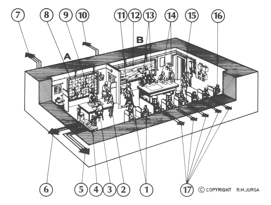 А - Пункт управления огнем фортификационной группы: 1 - отделение управления огнем; 2 - старший офицер отделения управления огнем; 3 - писарь; 4 - центральный коммутатор; 5 - линии связи с артиллерийскими блоками группы; 6 - линии связи с наблюдательными пунктами; 7 - прямая линия связи с артиллерийскими блоками; 8 - карты прилегающей местности; 9 - старший артиллерийский офицер; 10 - линии связи с командным пунктом артиллерийской поддержки. В - Отдел разведки: 11 - делегат связи; 12 - панорамные фотоснимки окружающей местности; 13 - писари; 14 - сержантский состав; 15 - старший офицер отдела; 16 - центральный узел связи группы; 17 - линии связи с наблюдателями. Нажмите для увеличения |