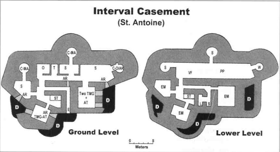 Условные обозначения. S Комната О Офицерская комната T Телефонный коммутатор ST Лестницы Е Вход для гарнизона AR Пулемет AT Противотанковые пушки TMG Спареные пулеметы C-МА Универсальная оружейная рама D Канава PP Силовая установка EM Казарма VF Вентиляция и фильтры L Cанузел Нажмите для увеличения |