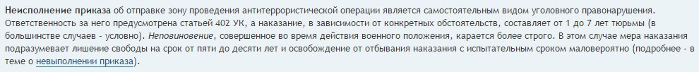Цитата (Саша Белый @ Сегодня, 09:57) Но кто очень сильно не хочет, тот в АТО не едет. Остается в гарнизоне на "подмену в случае чего" (и для дальнейшей воспитательной работы ) и на черные рабочие работы. Видимо есть какой-то закон. Цитата (Orlenard @ Сегодня, 10:05) Моего хорошего знакомого поставили перед выбором. Пол года "на фронте", или два года "в тылу". Выбрал первое. С другой стороны какой-то произвол. Цитата (МИХАЛЫЧ @ Сегодня, 10:03) за денюжку то понятно. Но... это у них армия или как? Т.е. призывника направляют в какую то часть, а её перебрасывают туда. Вот надо так - и всё. Или еще как, вариантов масса. Меня интересует процесс - "не, я не поеду, не хочу". Вариант с "откупиться", "договориться", "заболеть" - понятен. А вот так вот - не хочу и все? Ну ну... Любая армия построена на единоначалии, а оно в свою очередь на безусловности и обязательности исполнения приказа. Вывод: скорей всего есть закон позволяющий участвовать в АТО на принципах добровольности, но т.к. не установлена ответственность за его нарушение, в т.ч. путем отдачи приказа, то он работает за деньги и др. ништяки. Прав? -------------------- Ислам это политическая идеология, которая прячется за религией © М.Флинн