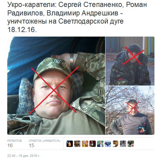 27333 30 19.12.16 15:39Смена растет, или почём нынче пара ведер солдатской крови Вчера с раннего утра началась активизация боевых действий на Дебальцевском направлении. Провластные и "не очень" СМИ, волонтёры и блоггеры наперебой начали тарахтеть и строчить про очередное "нарушение минских договорённостей" боевиками Л/ДНР и прочую туфту. Интересно, кого они надеялись обмануть? Противник знает не хуже нас, что там происходит, а ОБСЕ и прочие "подслеповатые" организации болтовню в нашем "эфире" не особо слушают. Выходит, лапша эта для внутреннего потребления… На самом деле произошло очередное страшное воинское преступление! Преступление, в последствиях которого уже минимум 5 погибших воинов ВСУ и три десятка раненых. Причём этот боевой эпизод ещё не закончен и счёт не закрыт. Почти полгода назад, в последних числах июня, совсем рядом, практически тем же составом фигурантов было совершено аналогичное преступление. Оно тоже было кровавым. В результате того преступления в первый же день погибло два бойца, а в последующие смерть добрала в свой урожай ещё нескольких воинов. Счет ранениям был за три десятка. По полученным позже относительно достоверным данным, мы произвели "размен" своих воинов, в том числе оперного певца с мировым именем, на "автомойщиков", служащих во 2-м АК (ЛНР) за тарелку супа. По раненым же счёт был, очевидно, не в нашу пользу. Тогда прикормленные "надёжные источники информации" и просто идиоты-"повторители" тоже пытались из воинского преступления раздуть "феерическую победу"… Что же произошло полгода назад и происходит сейчас на "Светлодарской дуге"? Что объединяет эти два события, столь дорого обходящихся Украине? Во-первых, это бригада ВСУ, в полосе обороны которой это произошло. Речь о 54-й бригаде, которой командует молодой "одарённый полководец" Владимир Горбатюк. Бывший командир контингента ВСУ в Косово, отсидевшийся в столь "опасном" для украинского офицера месте главные бои за независимость. За что-то Кавалер высшего военного ордена и просто лично близкий к НГШ Муженко "военный мажор" (наверное, как раз за это). Во-вторых, причиной обострения на фронте, в результате которого погибли и были ранены наши воины, были ИНИЦИАТИВНЫЕ ДЕЙСТВИЯ командования этой самой бригады с полным "согласием" (скорее по инициативе) высшего руководства. С учётом того, что молодой комбриг часто бахвалится своими близкими отношениями с НГШ, есть основание полагать, что эти действия были с ним (с Муженко) согласованы. Кстати, комбриг не единственный "мажор" и близкое, доверенное лицо Муженко в этой бригаде. Формально, замыслом обеих операций был захват опорного пункта противника. Точнее, даже не опорного, а выдвинутой передовой позиции с гарнизоном под 10 человек. Разница только в том, что во втором (пока последнем) эпизоде гарнизон этой позиции был уже из 1-го АК, т.е. из ДНР (стык корпусов проходит по трассе Бахмут-Дебальцево). То, что эти позиции имели какое-то тактическое или "стратегическое" значение, является чистейшей ложью. При "незашоренных" судьях могу это элементарно доказать! Я хорошо знаю те места и линию соприкосновения на этом участке, гораздо лучше бригадных (и выше) "полководцев". Любое незначительное продвижение вперёд там не только не полезно, но и, напротив, в большинстве случаев вредно. Наши "крупные военачальники" обычно оценивают поле 