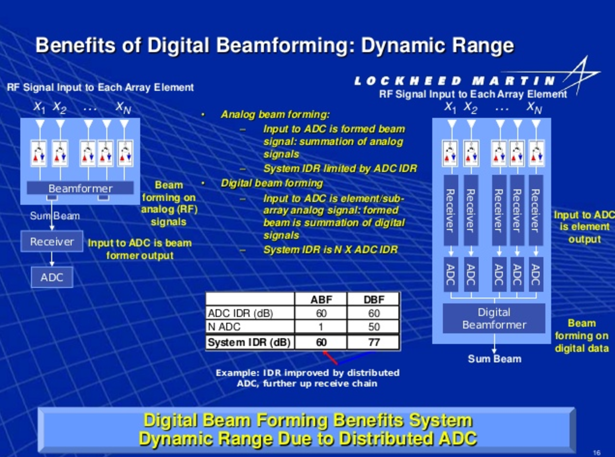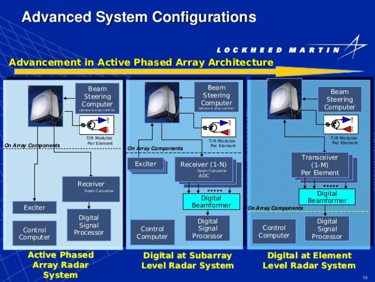 Цитата (Вуду @ Мар 25 2017, 20:42) - "Пальцем ткни"? И как переводится beam steering computer?! Разве не как компьютер управления лучом?! Т.е. - диаграммой направленности антенны, т.е. каждым приёмно-передающим модулем?! Да-да цифровое управление каждым элементами. Но это - аналоговая афар. Поскольку управление аттенюаторами и фазовращателями хоть и цифровое, но вот само формирование луча - аналоговое, простым суммированием сигнала в общем на все элементы приемнике. По-буржуйски это называется analog beam forming: ![]() Цифровые ФАР - это у которых происходит цифровое формирование луча. По буржуйски - digital beamforming. Для этого потребен отдельный ресивер-оцифровыватель на каждый элемент (правая картинка) или хотя бы на группу элементов (картинка посередине): ![]() И как же так получается, Михаил Исакович? Продвинутые американцы до сих пор топчутся на схеме с аналоговым формированием луча, а какие-то ватники из Мухосранска клепают РЛС по средней (Противник-ГЕ) и правой (Небо-СВУ) схемкам из презентации Локхид-Мартина? Что это за непотребство? Кто допустил? |