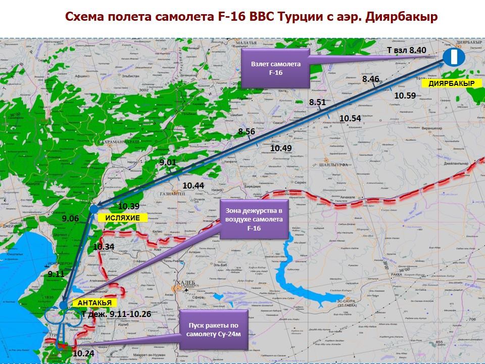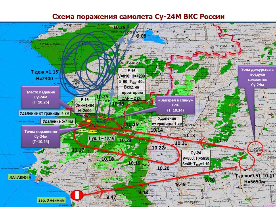 Турецкий истребитель, атаковавший российский бомбардировщик Су-24, производил пуск ракеты, находясь над сирийской территорией. Максимальное удаление от границы составило два километра, общее время нахождения в сирийском воздушном пространстве — 40 секунд. Дистанция при атаке составляла 5-7 километров.