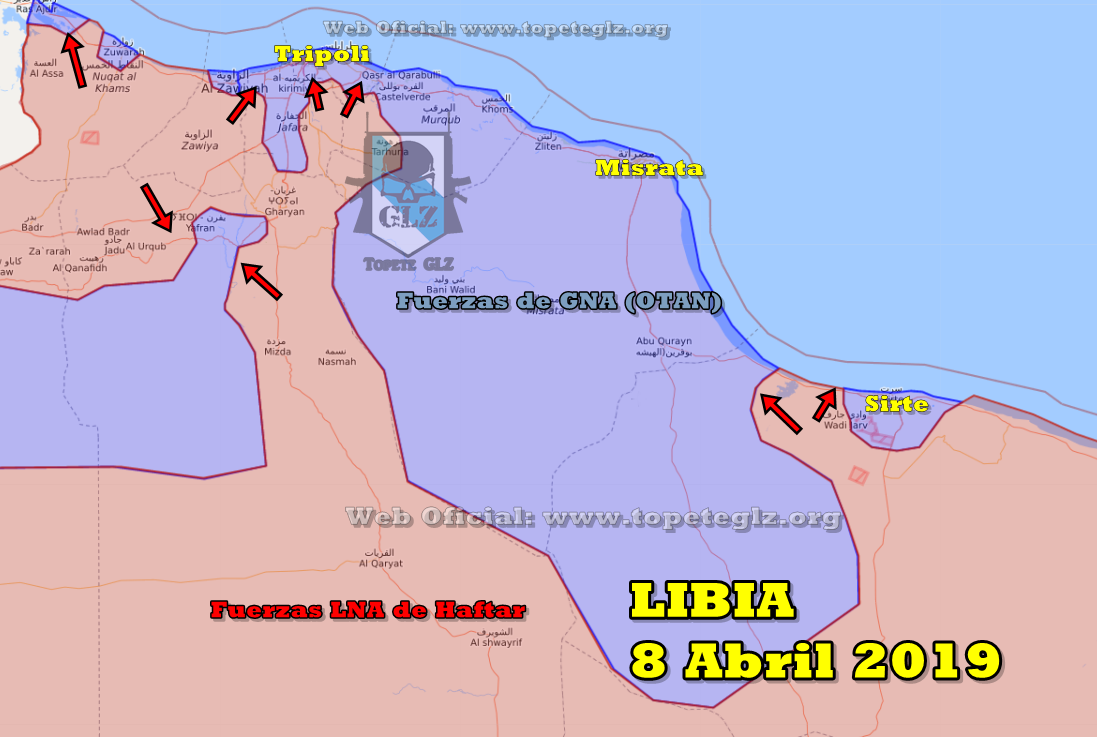Битва за Триполи. Перегруппировка сил ЛНА принесла свои плоды. Вечером 9 апреля армия Хафтара вновь перешла в наступление. Были возвращены утраченные прошлым днем позиции в аэропорту и лагере Ярмук. Развивая успех, силы ЛНА разбили 42-й батальон сил ПНС и взяли штурмов его базу. Утром 10 апреля к силам ЛНА пришел еще более крупный успех. Им удалось занять военную базу противника Эль-Азизия в 40 км от ливийской столицы. Было захвачено несколько единиц бронетехники. В данный момент силы ЛНА объективно одерживают верх над противником, однако, учитывая уровень подготовки и мотивации личного состава сторон, говорить о стремительном штурме ливийской столицы не приходится. Вероятнее всего бои в районе Триполи примут затяжной характер. Нажмите для увеличения -------------------- "Люди, это не Бармалей, Бармалея расстреляли сионисты!" (PLTV)