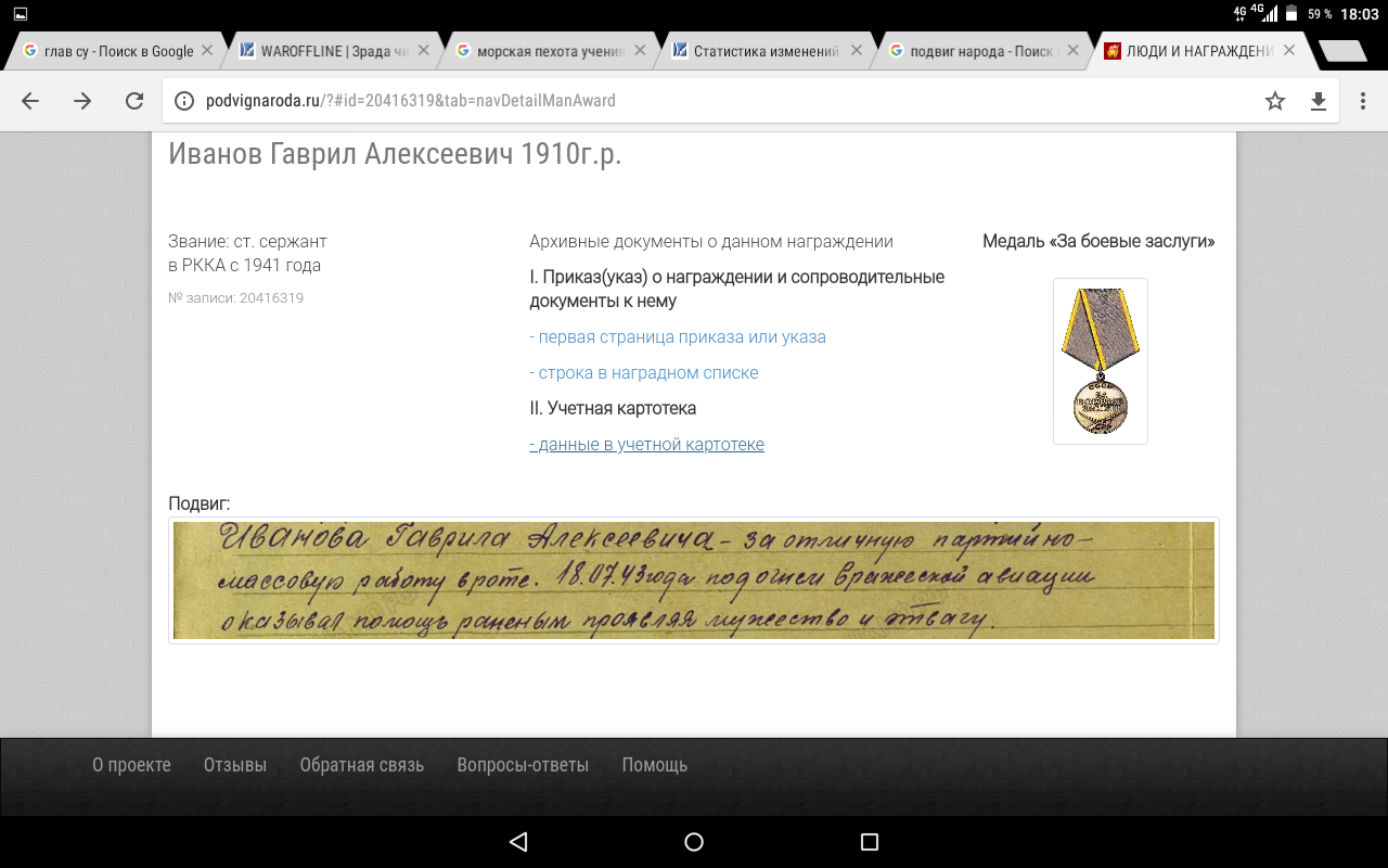 Цитата (S_S @ Май 4 2018, 09:54) Нашёл своего деда, три медали: "За боевые заслуги", За отвагу" и "За взятие Будапешта". Только в одном приказе фамилия написана без ошибки, который напечатан. В двух других, рукописных с ошибками. В одном даже год рождения указан неверно. Но то, что это всё его - несомненно. Место призыва, звание, часть - одни и те же. Призвали в марте 1941 и до Победы. Опа-на! Нашёл ещё две награды к этим трём: Ещё одну "За отвагу" и орден "Красной Звезды". Ну и поиздевались над фамилией, на слух, что ли писали, кому где "а" и "о" слышались. Отец говорил, что медалей у деда было много, но я ни одну уже не видел - до меня растащили. |