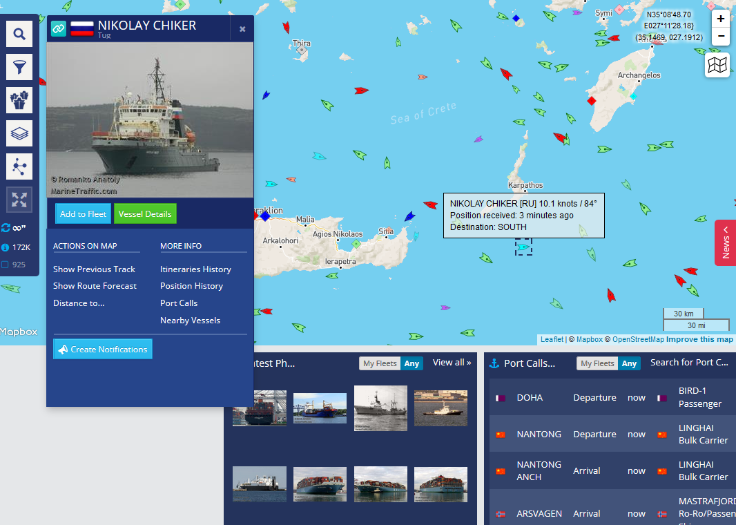 "Чикер" по-прежнему дрейфует у восточной оконечности Крита (данные с транспондера актуальные, обновлены 20 мин назад):
