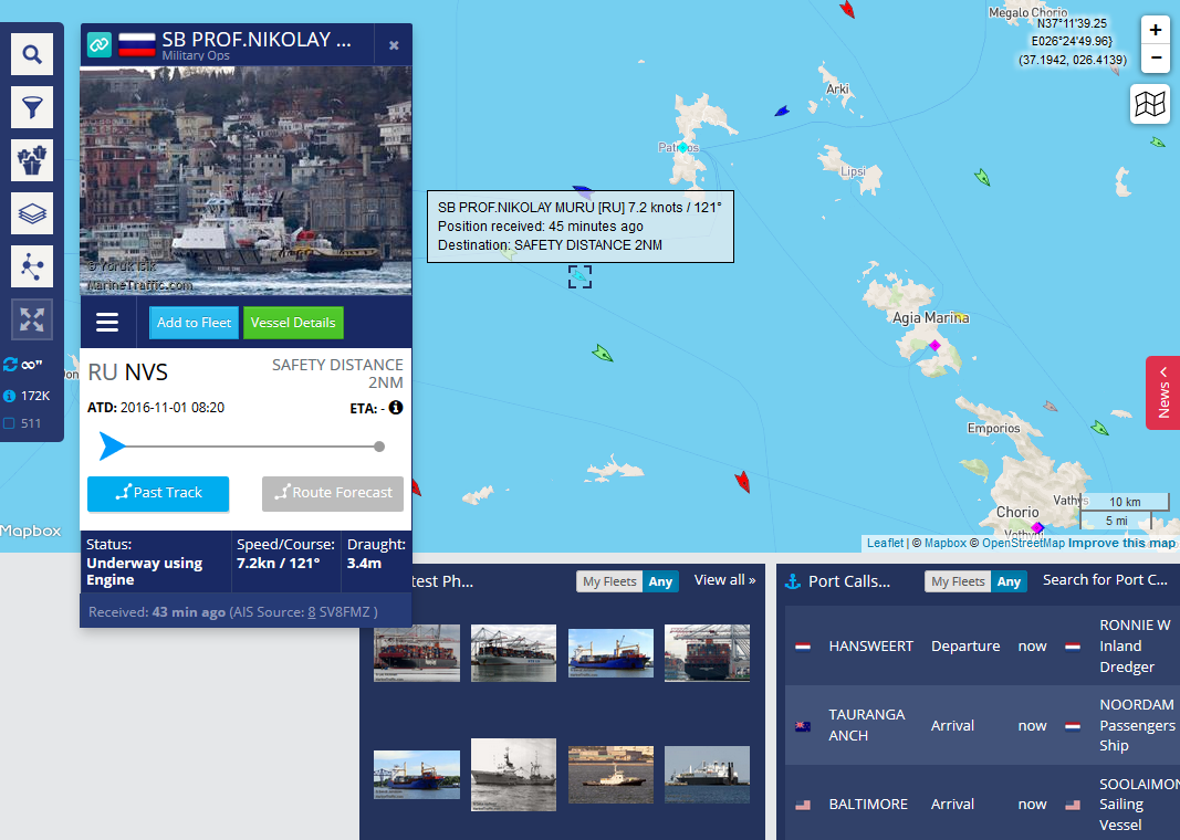 Цитата (pfc_joker @ Ноя 6 2016, 13:11) Возможный ответ на занимающую всех загадку: чего группа "Кузнецова" ждёт у восточной оконечности Крита? Возможно, они ждут, когда подойдёт "Адмирал Григорович" с Чёрного Моря. Считается, что "Григорович" идёт с буксиром "Профессор Николай Муру", который сейчас огибает Хиос: http://www.marinetraffic.com/en/ais/detail...OF_NIKOLAY_MURU "Чикер" по-прежнему на старом месте, только отдрейфовал немного юго-восточнее. Наверное, после соединения с "Григоровичем" пойдут к Сирии. Видимо, всё же решили не дожидаться "Чикер" сейчас идёт 10-узловым ходом на восток (а пару часов назад было даже 13 узлов), в то время как "Профессор Николай Муру" ещё в 130 милях к северу и ход у него всего 7 узлов. Положение на данный момент: ![]() http://www.marinetraffic.com/en/ais/detail...OF_NIKOLAY_MURU ![]() http://www.marinetraffic.com/en/ais/detail...:NIKOLAY_CHIKER (чтобы посмотреть текущее местоположение, нажимайте на Show on live map). |