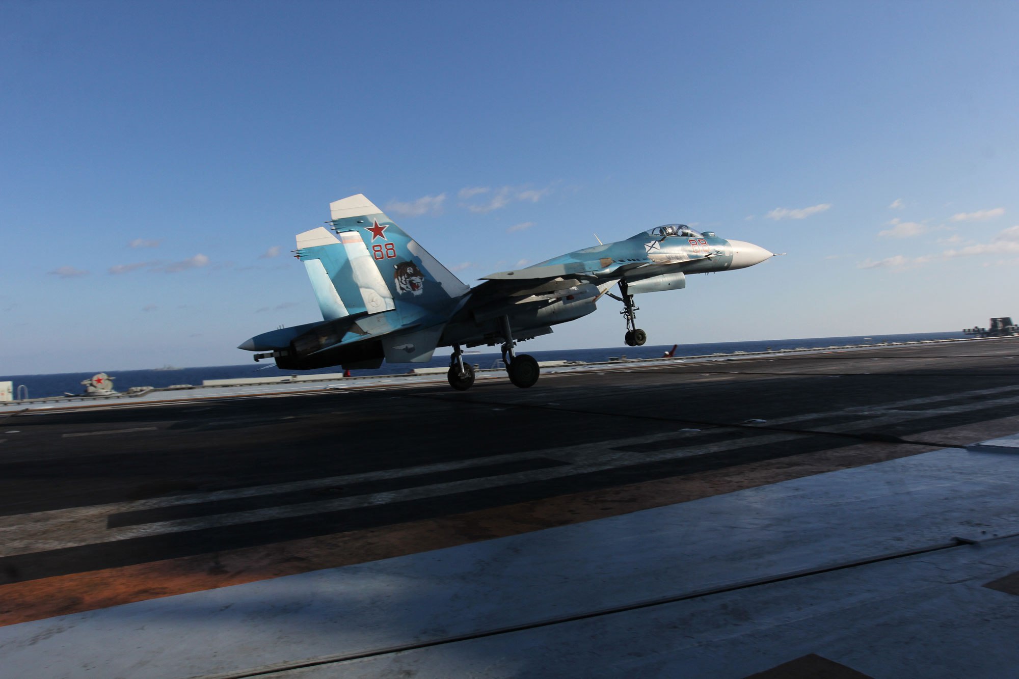 Три российские подводные лодки, две из которых — ядерные, находятся в Средиземном море с первой декады ноября. Первые две ядерные подводные лодки класса «Акула», оснащенные крылатыми ракетами «Калибр», вышли из Североморска (города, расположенного неподалеку от Мурманска) 29 октября 2016. Северному флоту принадлежит шесть «Акул», но только три из них находятся в эксплуатации и экипированы крылатыми ракетами «Калибр»: К-154 «Тигр», К-335 «Гепард» и К-317 «Пантера». К-335 «Гепард» — единственная реализованная субмарина класса «Акула III» — несомненно находится в Средиземном море. «Акулы» являются частью боевой группы «Адмирала Кузнецова».
