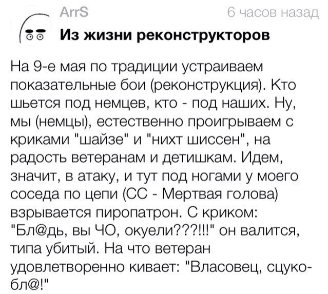 Михалыч как обычно набрасывает, я как обычно ведусь. Потом открываю что нибудь по типу советской всемирной истории в 24 томах или советской исторической энциклопедии в 16 и успокаиваюсь (С) fahed Меня всегда веселит эта черта в наших эмигрантах. Они всё знают лучше всех. Особенно, как правильно страной управлять. И всех пытаются учить. Ну езжайте домой и постройте так, как вам надо. (С) Juan Carlos Паранойя в наших рядах не приветствуется, но никогда нельзя забывать о том, что кругом одни враги! Не забудем Бармалея и Аталекса! Смерть фашистам! Ты не путай россиян, у 85% которых смысл жизни в основном грабь, воруй, еби гусей и где бы бояры накатить, и израильтян. (С) 12th |