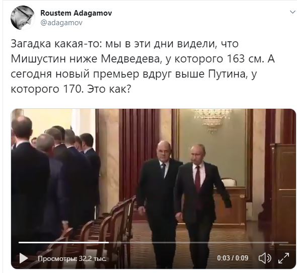 ![]() У Мишустина вроде как 160(165)см,у Медведева 163,а у Путина 170. Но Путин явно меньше Мишустина. Официальные данные врут? https://twitter.com/adagamov/status/1219690720124010496 -------------------- Да чо там? Расследование, понятное дело, не сможет юридически достоверно установить принадлежность ЗРК, сбившего Боинг. А разные косвенные доки и всякие снимочки с интернета юридически ничтожны. На них заключение не построишь. Тут, кстати, тактика наших властей - вкидывать вагон вбросов, достаточно действена. Глядишь, за кучей фейков правдивая информация потеряется.