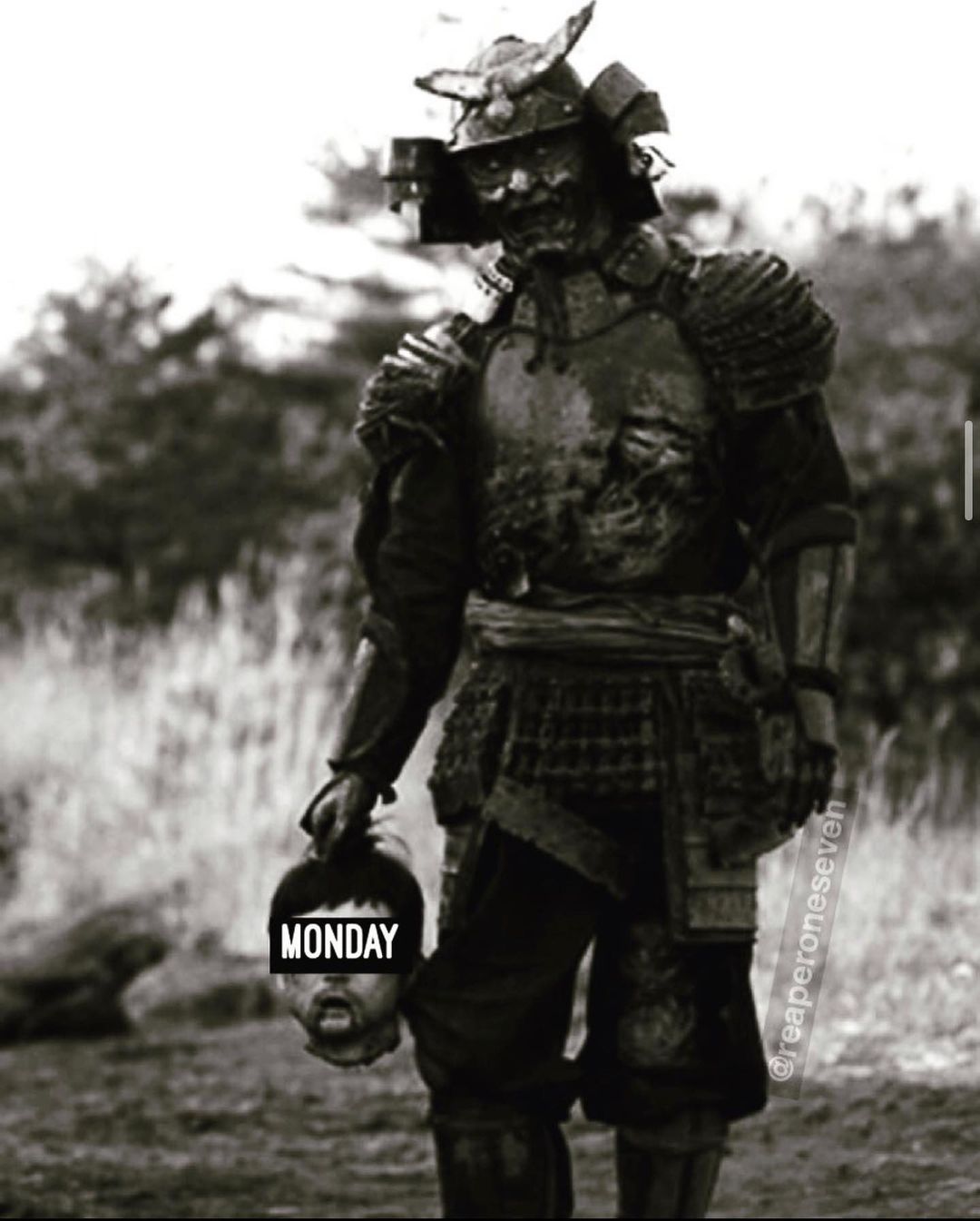 "В ту пору было ему лет двадцать, не больше. В темно-синем кафтане, окаймленном алой парчой по вороту и рукавам, в светло-зеленом панцире, опоясанный мечом с серебряной насечкой, преклонил он колени перед Ёсицунэ. Стрелы с орлиным оперением, темные с белой полоской, он почти все уже истратил в сегодняшней битве, но несколько стрел еще оставалось, концы их торчали выше головы из висевшего за спиной колчана, среди них – гудящая стрела "репа", украшенная соколиными и орлиными перьями вперемешку. Шлем Ёити снял и повесил через плечо на шнурах, а под мышкой он держал лук, туго оплетенный лакированным пальмовым волокном. <...> Конь у Ёити был вороной масти, рослый, могучий, сбруя увешана кисточками из шелковых нитей, лакированное седло украшено круглыми гербами – с выложенным перламутром цветком омелы."