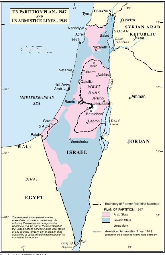 Кол-во скачиваний: 183http://www.un.org/ru/peace/palestine/part2.pdf Карта раздела Палестины с сайта ООН, поподробнее. Газа отмечена.Это что бы было понятно кто куда ломился.. И? Я так понял, столкновения идут на демаркационных линиях 49-го года? |
