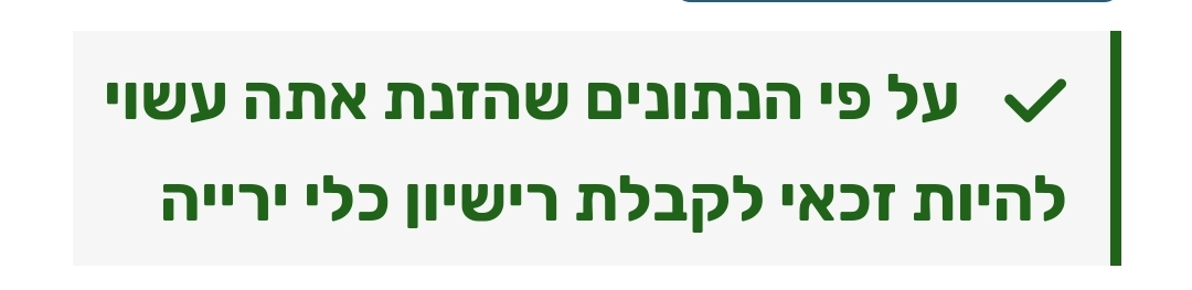 Цитата (12th @ Окт 10 2023, 13:36) Можешь начать отсюда. Возможно немало удивишься https://www.gov.il/apps/mops/firearm_license_calculator/ Не удивился Ну вот это "עשוי להיות זכאי" напрягает немного Вопрос сколько времени это возьмет Нажмите для увеличения |