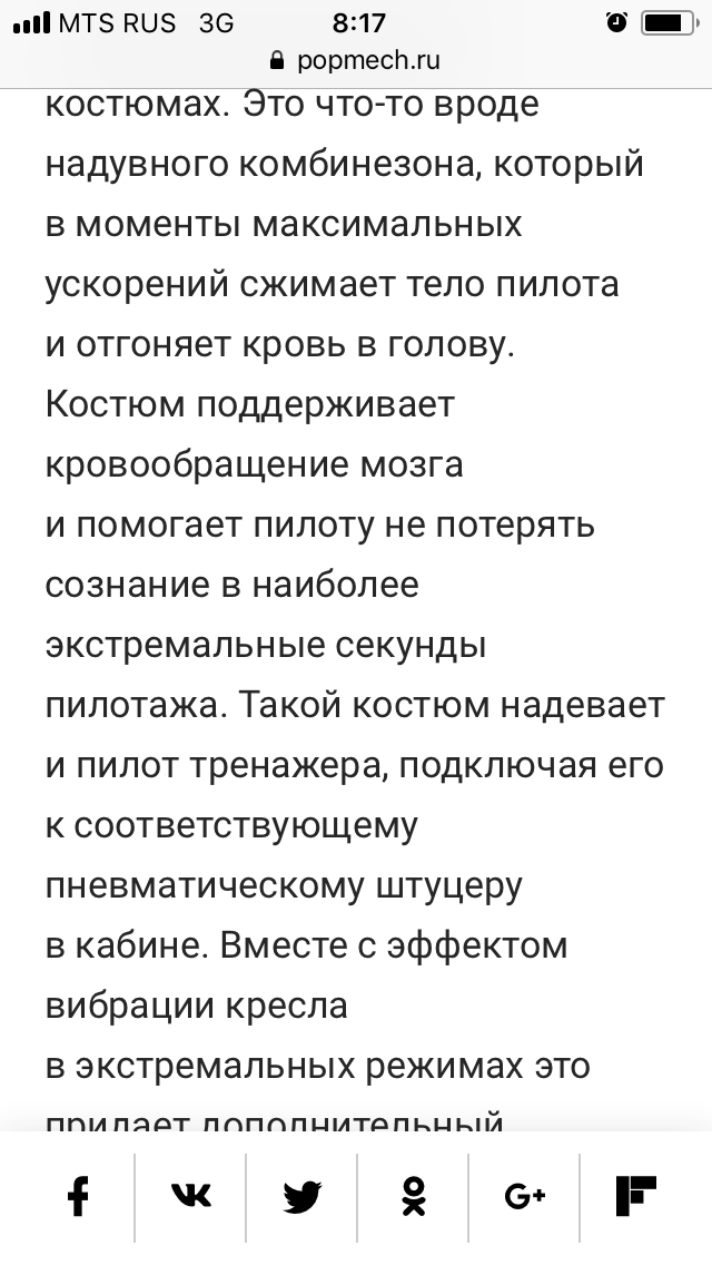 Цитата (CB_2 @ Вчера, 16:43) Цитата (Red @ Июл 23 2018, 15:13) Как? Как противоперегрузочный костюм летчика, только по обратному алгоритму. В полете (при реальных перегрузках, для их компенсации) он создает избыточное давление в тех участках тела, куда кровь приливает, а при симуляции перегрузки на тренажере - наоборот, там, откуда она должна отливать. Сам костюм при этом вроде даже тот же самый, только управление системой регулировки давлений идет не от датчиков перегрузки, а от параметров виртуального движения симулятора в тренажере. - Полная херня! Цитата Вопрос в том, насколько такое воздействие на организм эквивалентно реальной перегрузке (т.е. о качестве симуляции), но сама симуляция есть. На словах говорят, что более-менее похоже. - Врут. -------------------- "Верблюда можно силой привести к воде, но нельзя силой заставить верблюда напиться..."