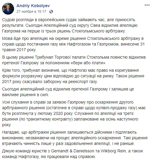 Цитата Решение суда подтверждает отмену Стокгольмским арбитражем требования «Газпрома» относительно положения контракта «бери или плати», что освобождает Украину от обязательства выплатить российскому монополисту 80 миллиардов долларов. Трибунал также постановил, что «Нафтогаз» имеет право на рыночную корректировку формулы цены. Кроме того, снимается запрет на реэкспорт газа, что было частью контракта. Также, по словам Витренко, «Газпром» должен компенсировать «Нафтогазу» расходы на судебный процесс, которые в сумме составляют один миллион евро и 1,65 миллиона гривен. Данное решение не может быть оспорено по сути. Но, несмотря на это, Украине рано расслабляться, поскольку пока суд отклонил апелляцию россиян только на одно решение, принятое в Стокгольме, а в феврале и осенью 2020 года пройдут слушания по двум другим жалобам «Газпрома». «Устные слушания по делу о заявлении «Газпрома» об обжаловании второго арбитражного решения (окончательное в деле по купле-продаже газа) должны быть рассмотрены в феврале 2020 года. Слушания по апелляции на третье решение (по транзитному контракту) запланированы на осень следующего года», - сообщил глава «Нафтогаза» Андрей Коболев. Подробности читайте на УНИАН: https://www.unian.net/economics/finance/107...et-rekordy.html ![]() -------------------- Ценность любого оружия определяется успешностью его применения и готовностью к использованию в нужном месте и в нужное время.