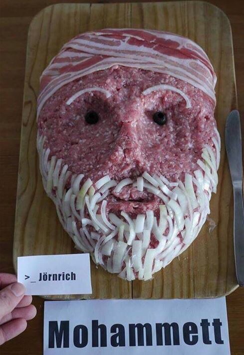 Вот картиночка с кулинарного конкурса в Германии. На поварской доске из фарша (свиного, высшей кошерности) выложен портрет бородатого мужчины (борода красиво сделана из нарубленного лучка, чалма из бекона). Подпись: Mohammett. Тут тебе и самобытный немецкий йумор, и забавнейшая игра слов. Mett - это по-немецки значит свиной фарш и ряд национальных блюд из сырого фарша со специями (да, они такое едят). Ну а Mohamett ярко выажает отношение простого немецкого повара к Религии Мира и Добра и её основателю. |