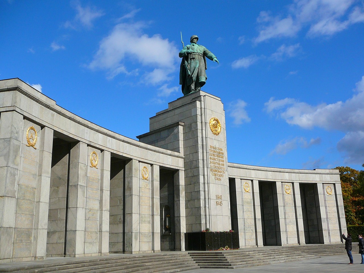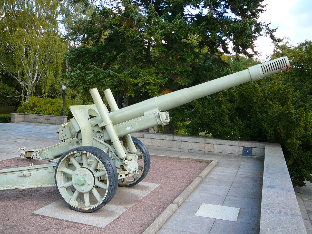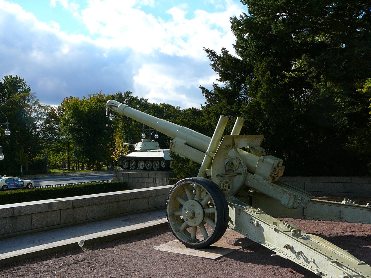 Самый центр Берлина, Tiergarten. Мемориал нашим павшим. Пока существовала ГСВГ, здесь всегда стоял советский почетный караул. Хоть это и был английский сектор. ![]() Перед мемориалом стоит два Т-34 и две гаубицы. ![]() Выкрашенные катки, новенькие гусеницы, на них георгиевские ленточки. Постоянно меняются на свежие - поток туристов вешает. На пъедестале всегда цветы и свечки. До Рейхстага примерно километр. ![]() Тридцатьчетверка образца 43 года. С командирской башенкой. В башне свил гнездо простой немецкий воробей. Он гордо сидит на орудийной маске. ![]() Пушки, кстати, обе выпуска 1941 года, у них и быбитые номера с датами есть. Видно, что пушка боевая - все бандажи на колесах побиты на дорогах и ухабах. И снова георгиевские ленты на дульном тормозе. ![]() А вот тридцатьчетверочки со свежепокрашенными гусеницами и новенькими колесами с резиновыми бандажами. Хоть сейчас садись и в атаку! ![]() Читаешь фамилии на этих стеллах, и сразу ясно, кровью народа какой страны куплена победа. |