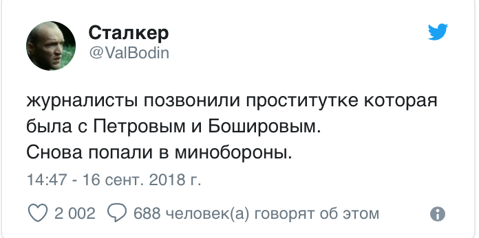 Цитата (Juan Carlos @ Сен 17 2018, 02:10) а вот говорили еще, что это и вовсе не ГРУшники, а просто левые чуваки, что они спортсмены и фитнес продвигают, спопртпитанние продают, всё такое... хоть что-то из этого подтвердилось? ну, там, фирма ихняя, или спортзал, сайт какой, паблички в соцетях? у меня, например, вкантактеке несколько таких знакомых, кто тренера по борцухе и кроссфиту разному, кто советы дает и консультации, клиентов так ищут, маркетинг-хуетинг. а у этих ребят такое есть? или они свое спортпитание тупо у метро продавали, или на колхозном рынке, где бабульки с огурцами и грибами стоят? Хотя бы справку из ГРУ предьявили что ли. О том, что они не являются сотрудниками ГРУ. -------------------- К несчастью, мир сейчас не таков, каким был раньше. Дети