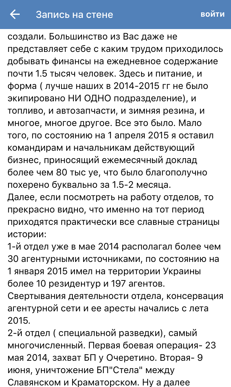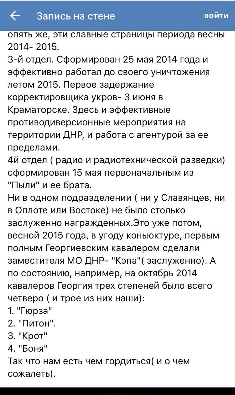 Цитата (12th @ Июл 1 2018, 21:22) СБУ которое россиянин Безлер захватывал? Или какое то другое СБУ? Наверное, какое-то другое. Цитата 6 апреля 2014 года славянское ополчение захватывает здание СБУ в Донецке. Вот что об этом рассказывает Вячеслав Пономарев: «В начале апреля в интернете появилось обращение якобы от имени НОД, которое сделали три человека в масках и с автоматами — похоже, игрушечными. Они призывали жителей Донецка выйти на улицу и вновь штурмовать администрацию, при этом упомянув, что с собой надо взять оружие. Мы это расценили как провокацию. Я отзвонился своим координаторам и сказал, что мы ни на какие штурмы администраций не пойдём. Мы решили, что надо брать не администрацию, а областное СБУ, а потом — городское и областное МВД. Мы определились, что для штурма СБУ нам понадобится порядка 200 человек. Я собрал объединённый отряд из наиболее боеспособных людей из Славянска, Дружковки и Константиновки, часть из которых являлась бывшими военными, умевшими обращаться с оружием и знавшими, на что идут. В 4 утра 6 апреля мы маленькими группами на частном транспорте заехали в город Донецк, там к нам присоединилось где-то около сотни дончан. В итоге мы зашли в здание СБУ первыми, там нас встретили 40-50 милиционеров со щитами и в касках. Нам удалось договориться с их старшим, чтобы они покинули здание. Они вышли из здания под аплодисменты собравшихся людей и крики «милиция с народом». Мы взяли сначала верхний склад оружия — там были одни пистолеты — а потом нижний, где лежали автоматы, боеприпасы и пара-тройка «мух». Этого оружия тоже было недостаточно, боеприпасов нам хватило бы примерно на 7-10 минут боя. К 9 часам туда съехалось милицейское начальство, мы с ними поговорили, а к 10 часам подъехали Игорь Безлер и «Волк». Потом прибыли местные «верхи» СБУ, которые привезли своих ветеранов — с некоторыми из них я был знаком по антикоррупционной деятельности. Я объяснил им, чего мы хотим, на том и разошлись. Мы выдвинули требование освободить ранее арестованного Павла Губарева (хотя это, конечно, было сказано для красного словца), мы также требовали самостоятельности для Донбасса, чтобы народ сам решал свою судьбу. Позже к нам пришла информация, что из Запорожья и из Киева выдвинулись две группы захвата для штурма здания областного СБУ. Мы приготовились к обороне, начали строить баррикады. Но потом, посовещавшись, решили оставить здание, поскольку боеприпасов для организации нормальной обороны у нас не было. Наша задача была выполнена, оружие и боеприпасы мы взяли. Мы решили сначала отработать боевое взаимодействие и уже потом более подготовленными выступать дальше. Мы аккуратно его покинули, последний наш человек вышел за 10 минут до штурма. Они штурмовали пустое здание». https://friend.livejournal.com/1588183.html -------------------- К несчастью, мир сейчас не таков, каким был раньше. Дети
