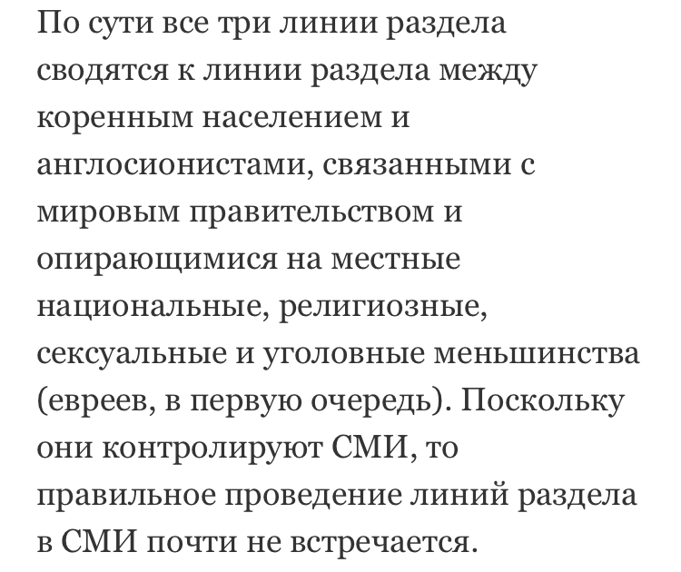 Цитата (12th @ Дек 18 2018, 10:56) Какой отличный сайт. Там же много отличных статей. Мне вот эта вот понравилась ![]() https://cont.ws/@30091963/1163110 Такой вопрос. А вот в Израиле этих евреев большинство. И на кого ж там опираться этой самой мировой закулисе? Ведь нужно меньшинство какое-нибудь? Израильтяне, просветите, кто у вас в стране считается евреями? Ну, то есть, не просто евреями, а тем самым коварным меньшинством, на которое опираются рептилоеды, контролирующие СМИ? |
