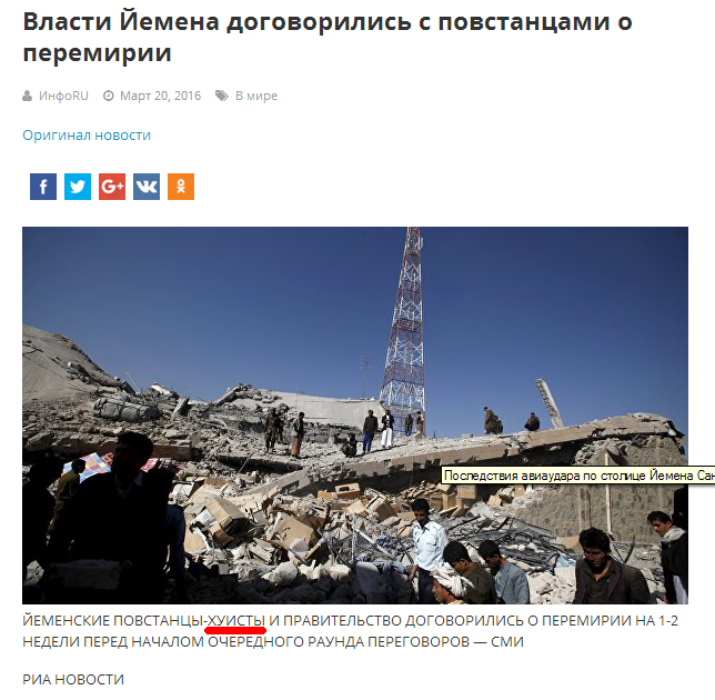 Цитата (Zigzavrion @ Мар 24 2016, 13:15) Президент Хади объявил о принятии хусиитами исполнения решения СБ ООН №2216 http://kahhar-786.livejournal.com/3578378.html Достигнута договоренность о перемирии в Йемене: http://www.newsru.co.il/mideast/24mar2016/yemen_202.html Интересно какие договоренности относительно будущего местоубытия Салеха. Ньюскоил такой ньюс,ну хоть кто нибудь слейте Иран,пускай не Путин,пускай это будут хуисты.) -------------------- Запомни Русь! Отчизна! Запомни! Отомсти!
