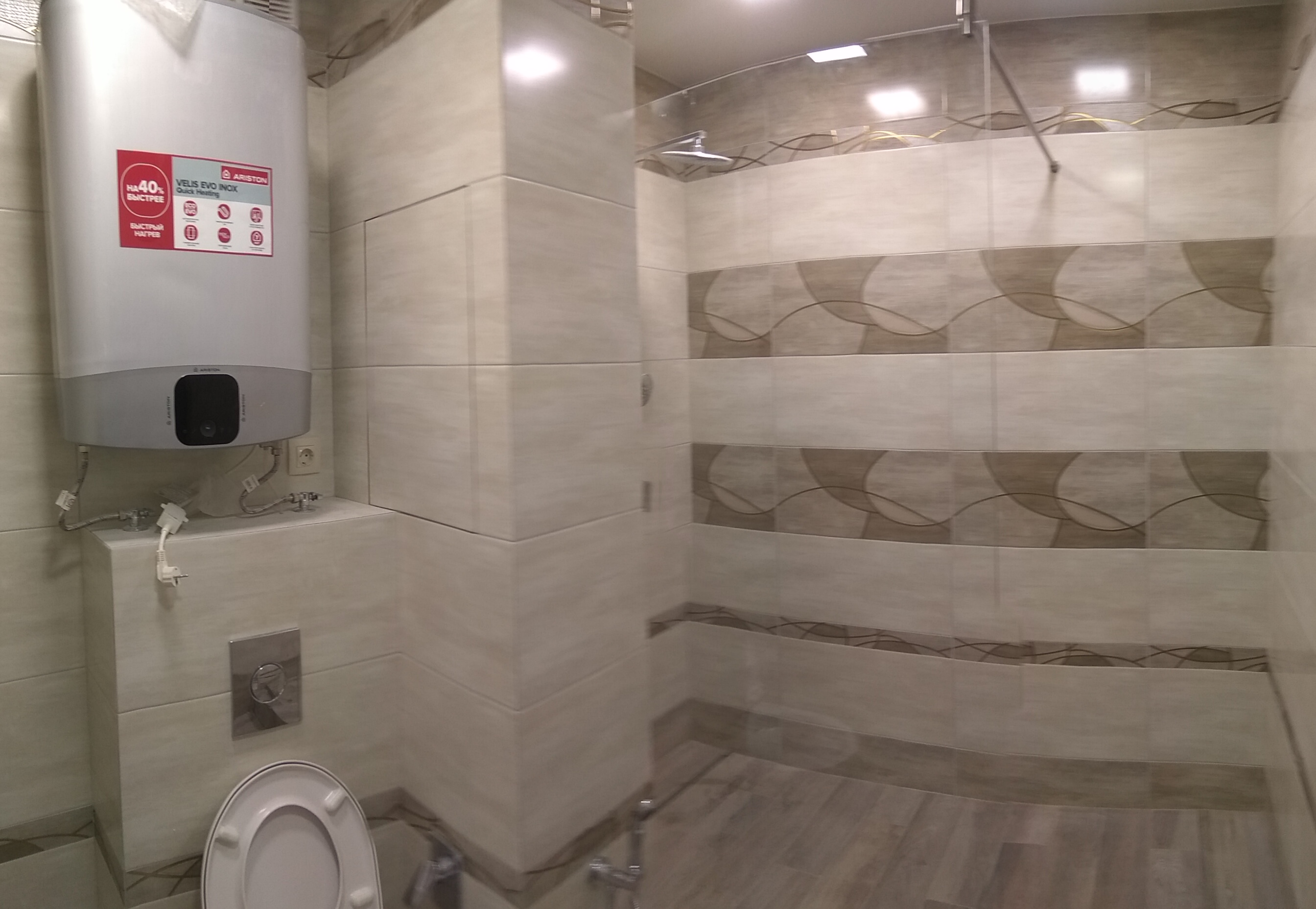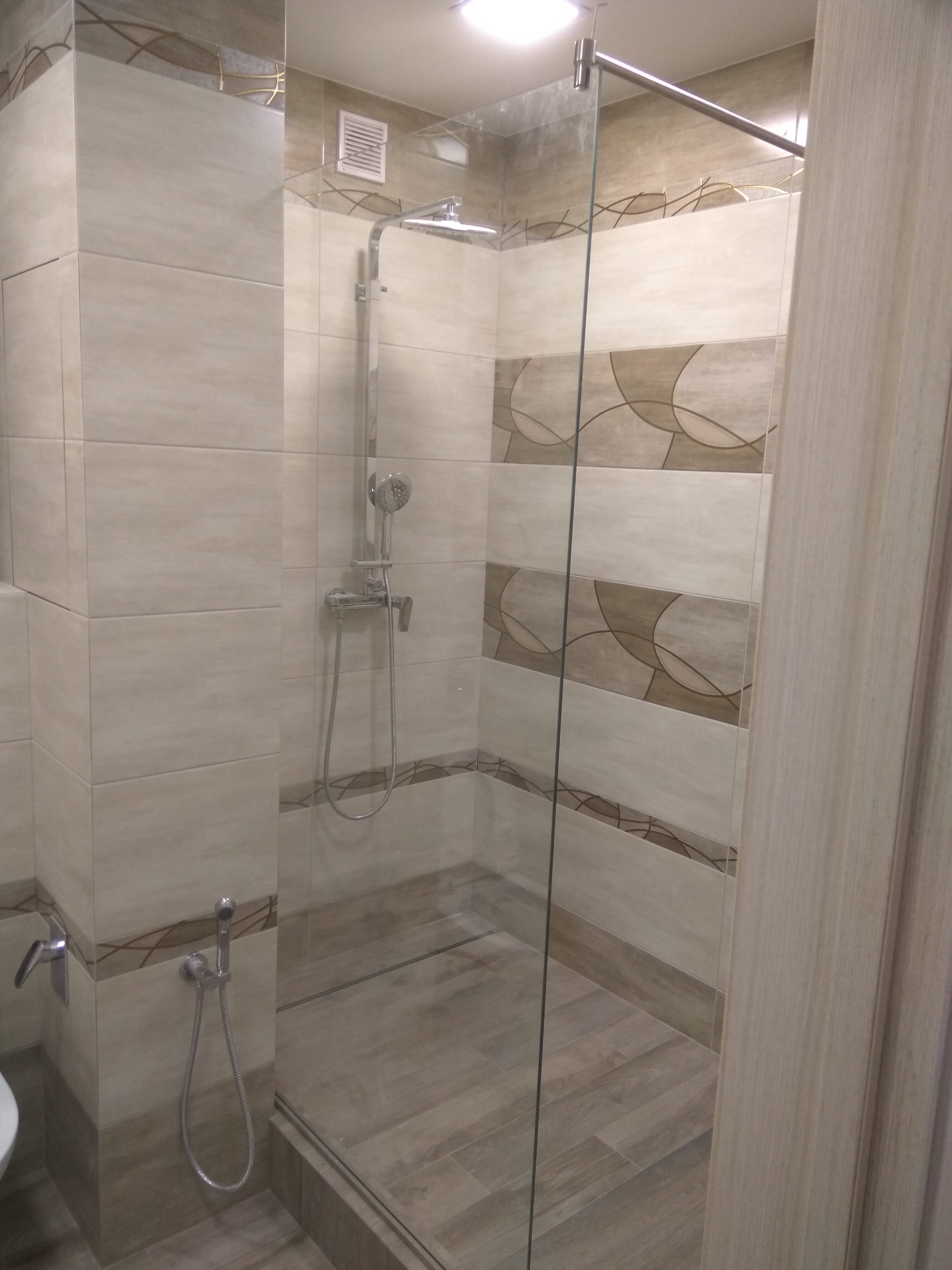 Добил-таки ремонт новостройки. Стоячий душ, как хотел, с подиумом и стеклом. Хотел на стекле полосу напескоструить да сказали, что это долго. Дверь не нужна т.к. длина душевой 205 см. Вода не долетает. Наверное.